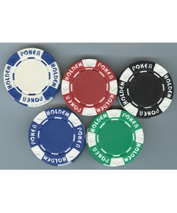 - “Holdem Poker” adorns this poker chip set