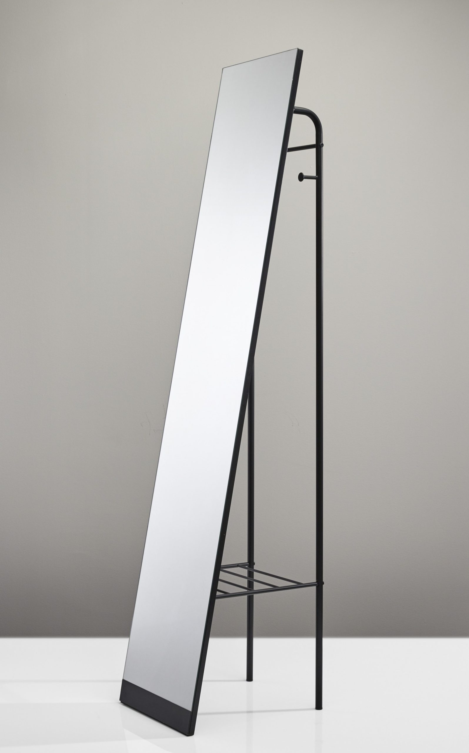 A timeless look, this Floor Mirror is both functional and decorative. With a freestanding design, this mirror can be placed anywhere in the room. A matte black finished frame allows for versatility to fit all design styles. Not only does this item function as a standing mirror, but it also has two coat hooks and a metal wire shelf for extra storage functionality.