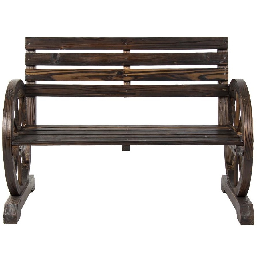 Seats taken!! Come rest your bones on the 2 Person Farm Home Wagon Wheel Wooden Bench. Crafted of solid fir wood with a dark brown finish, this durable bench is built to be a lasting cornerstone for your outdoor living. This 2-person bench adds a touch of country charm to your backyard or garden with its elegant, rustic design, great for your farm or barn. The bench’s curved armrests offer an eye-catching silhouette that provides comfortable lounging for you and a guest. Its lightweight design allows for easy portability, letting you to move this bench around for a change of scenery without the hassle.