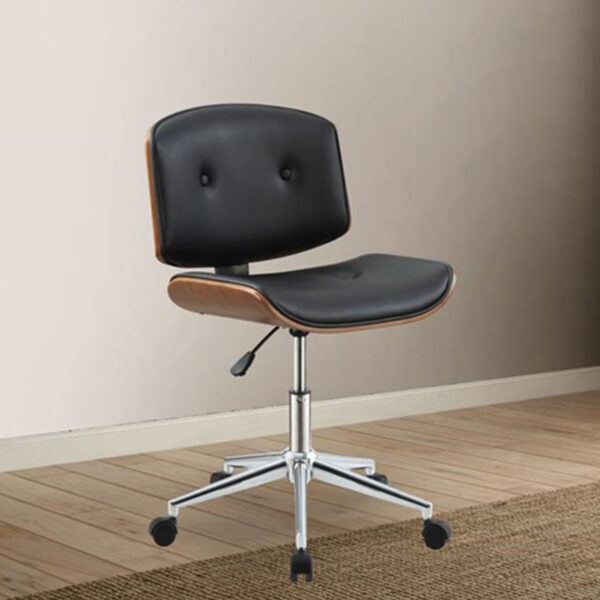Brighten the atmosphere of your beloved office or work space with our inspiring office chair. This piece is designed with your absolute comfort in focus. It features curved wooden walnut finish on the outside of the seat and backrest while black button tufted PU cushion outlines the interior part for your convenient seating. The padded seat rests on a metal base with 5-star casters for maximum support.