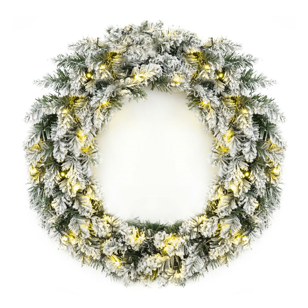 Invite all your friends and family inside your holiday winter wonderland this Christmas with this beautiful easy up 24in Pre Lit Flocked Faux Pine Holiday Wreath with 50 White LED Lights. Hangs in minutes and creates and inviting atmosphere for your guest. Has a 6 hour timer and cordless design. Powered by a small battery box.