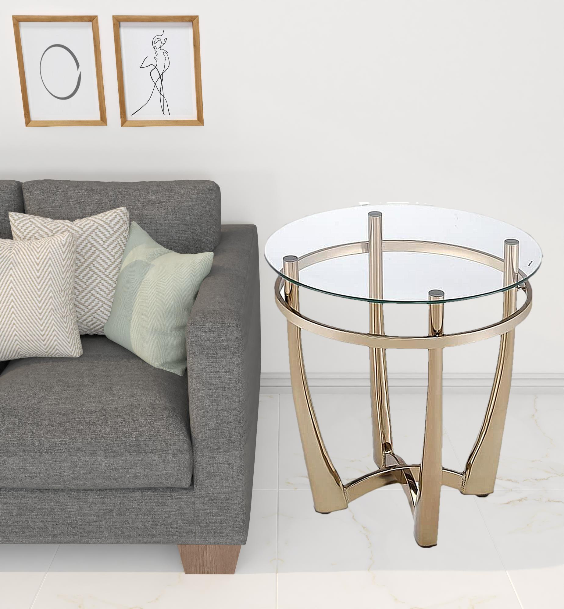 Distinctive in style the 25″ champagne gold and clear glass round mirrored end table radiates a versatile charm. Quality construction from the champagne gold stainless steel base combines with clear glass of the top to give this table a fresh and updated look. Reflective pieces of mirrored glass give this table a glamorous and unique look. Side tables are a great way to flank your sofa, use as an accent next to your favorite chair, or can even be used bedside. You can also use it as an entryway table to hold your keys. 25″ H x 23″ W x 1″ D