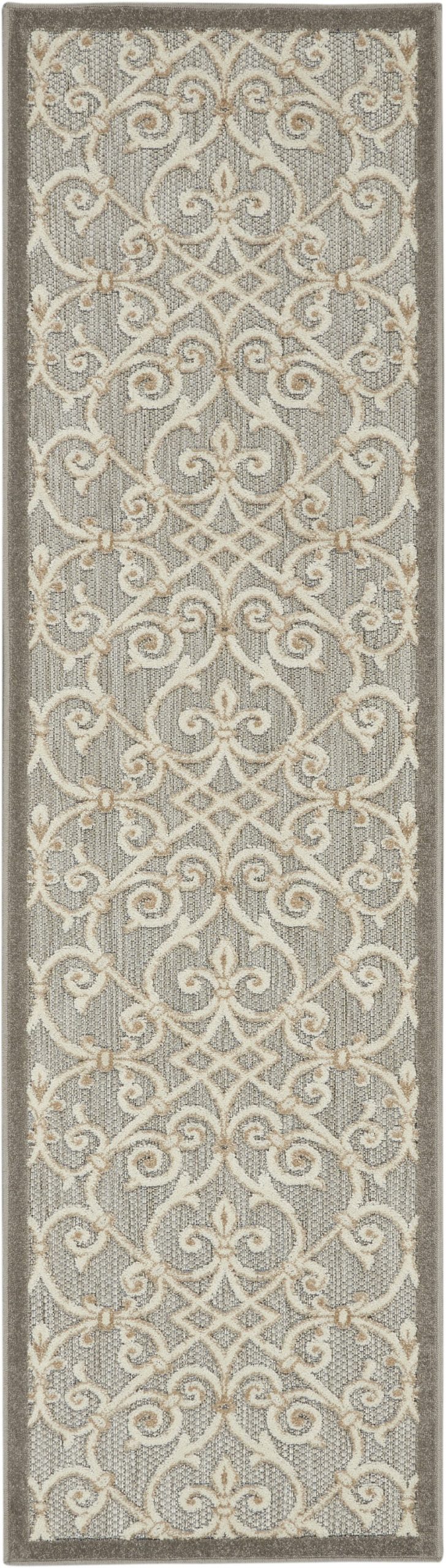 Renovate your living space or outdoor patio with this Natural and Gray Indoor Outdoor Runner Rug that features decorative patterns in a neutral color palette. Boasting the scroll patterns in the sophisticated hues of natural beige over a gray textured backdrop creating a luxurious appeal. The beautiful details are made to fuse effortlessly with a range of traditional and contemporary styles of decors. Durable polypropylene is used to make this beautiful rug stain-resistant, durable, and easy to clean. Skilfully crafted in Turkey, this brilliant rug features a soft pile construction that feels plush and luxurious on the touch. The charismatic design patterns and sophisticated color palette of this runner rug will add a tasteful hint of class and elegance to your contemporary interior. 2′ x 6′