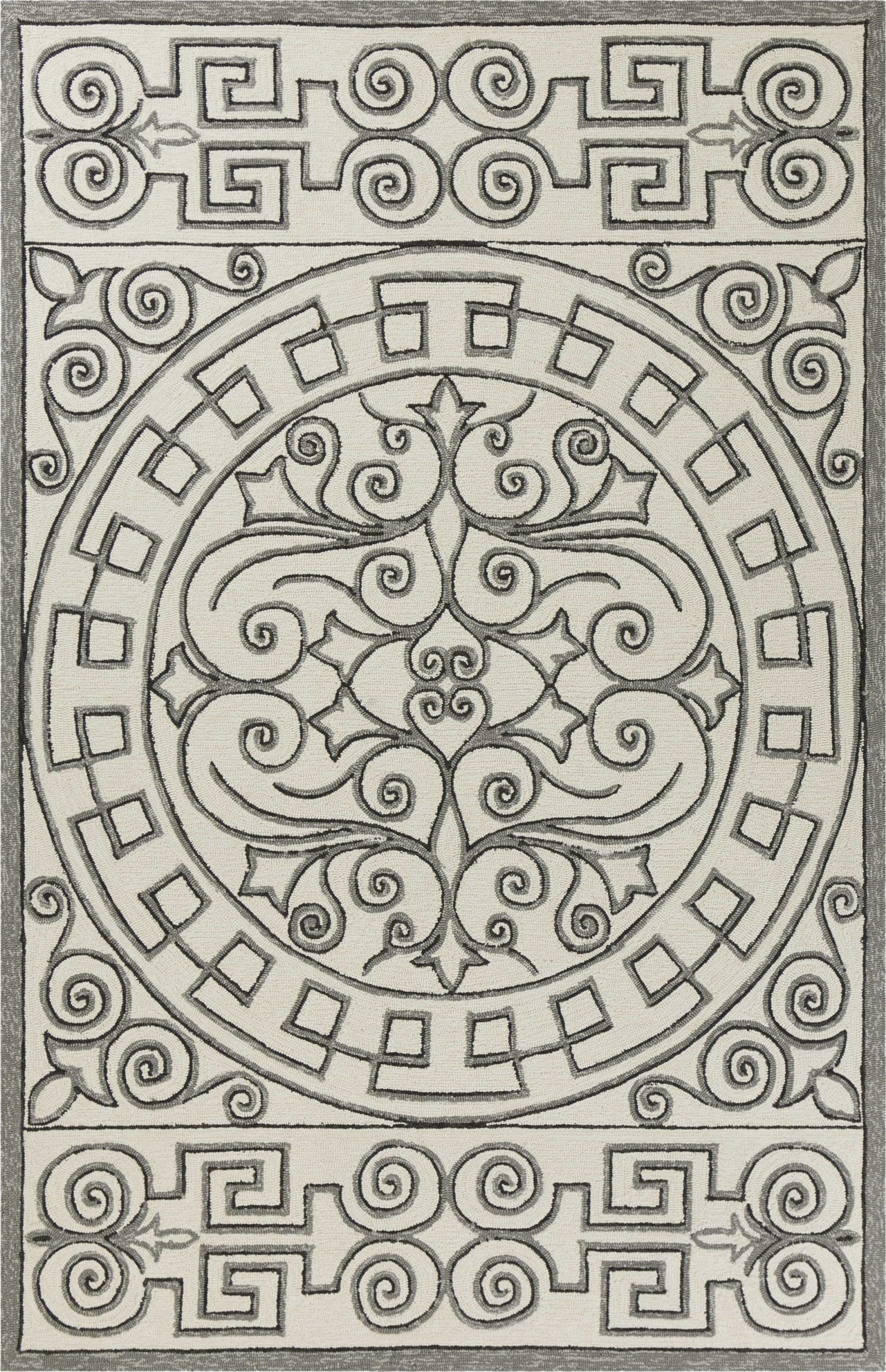 2’x3′ Ivory Grey Hand Hooked UV Treated Greek Key Medallion Indoor Outdoor Accent Rug