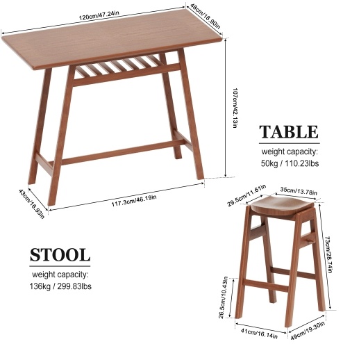 - [3PCS PUB DINING SET] This pub table set includes 1 rectangle table with round corners and two backless high stools, perfect for 2 persons to enjoy dining time. Table size: 120*48*107cm/ 47.24*18.9*42.13in. Stool size: 46*49*73.5cm/ 18.11*19.29*28.94in (L*W*H).