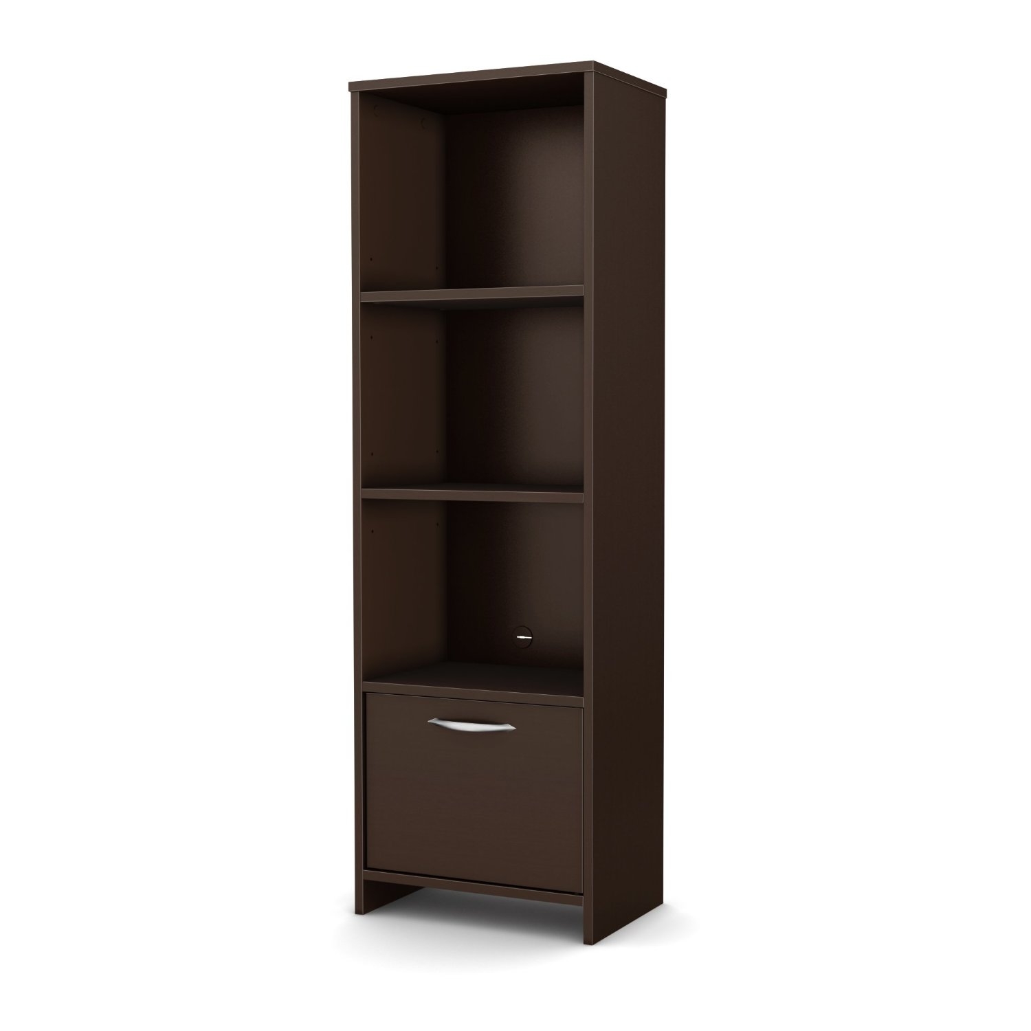 This 3-Shelf Bookcase with Bottom Door Storage Space in Chocolate features straight lines for a contemporary style. It can perform multiple functions such as the ideal media tower for holding your DVDs and game console, or simply as a handy bookcase or nightstand. It comes with 3 open, practical and accessible storage spaces, separated by 2 adjustable shelves that can support a weight up to 15lbs. each. In addition, 1 closed storage space at the bottom concealed by a non-reversible door equipped with a Nickel Brushed metal handle. It is also available in Chocolate finish. It measures 17-1/2-inch wide by 11-3/4-inch deep by 54-1/4-inch high. For complete dimensions, see spec sheet. It is delivered in a box measuring 59-inch by 13-inch by 4-1/4-inch and weighing 46lbs.. The back surface is not laminated and comes with a hole for better wire management. Accessories not included. Manufactured from certified Environmentally Preferred laminated particle panels. Complete assembly required by 2 adults. Tools not included. 5-year limited warranty. Made in Mexico.