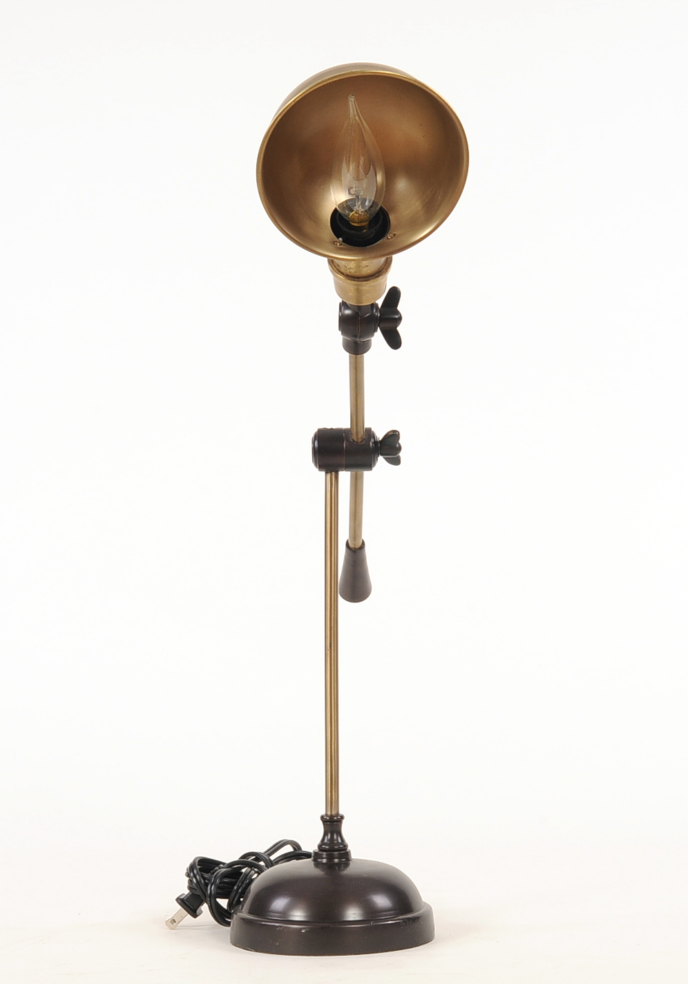 The idea of a desk lamp was tinkered with by many inventors throughout the 1920s until the parallelogram arm structure was finally agreed upon as a functional feature. Adjustable, bronze desk lamps are now a must for any office space or bed side. The nostalgic feel blends well with vintage or modern, giving you versatility in every way. ? Aluminum lamp with a brass base and shiny bronze finish ? 110 V/ 25 W bulb (bulb not included) ? Two-prong American plug
