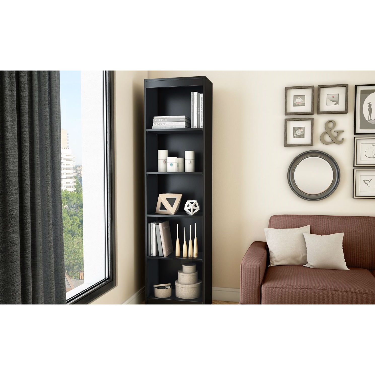 This 5-Shelf Narrow Bookcase Black Finish is ideal for your binders, books or decorative items. It features 5 open, practical and accessible storage spaces, separated by 2 fixed and 3 adjustable shelves that can support up to 30lbs. each. Its refined lines harmonize seamlessly with virtually any décor. Both functional and attractive with its sleek contemporary styling, this bookcase is sure to enhance the look of any room in your home. It is also available in Pure White, Chocolate, Royal Cherry or Morgan Cherry finish. It measures 19-inch wide by 11-1/2-inch deep by 71-1/4-inch high. It is delivered in a box measuring 77-3/4-inch by 12-3/4-inch by 3-1/2-inch and weighing 54lbs.. The back surface is not laminated. Accessories not included. Manufactured from certified Environmentally Preferred laminated particle panels. Complete assembly required by 2 adults. Tools are not included. 5-year limited warranty. Made in Mexico.