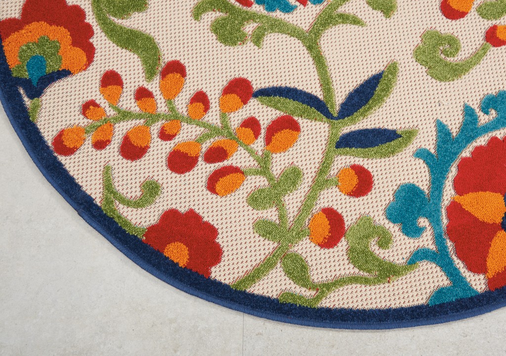 Bring the beauty of nature into your living area with this Round Mediterra Indoor Outdoor Area Rug that boasts bright and vivid colors in a magnificent floral artwork. The use of vibrant shades of blue, red, green, and orange on a soft touch ivory base brings a sense of warmth and comfort that is bound to tie in nicely with your contemporary decor. Skillfully crafted in Turkey with 100% polypropylene, this rug speaks of its durability and stain resistance to stand up to the messes and scratches of heavy foot traffic while flaunting the immaculate visual appeal in any indoor or outdoor setting. With floral buds and vines emanating an eye-catching color palette, this round area rug will spruce up any space setting an inviting tone. 5’3″