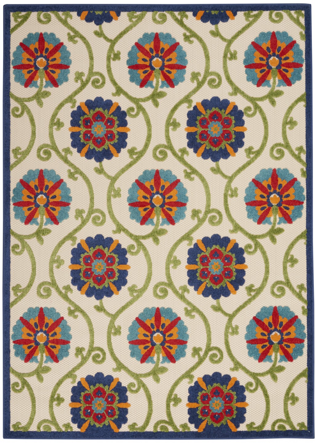 Artfully create a tropical ambiance for your home with this Blue Vines Indoor Outdoor Area Rug that flaunts its nature-inspired design in a vibrant color palette. The red-accented dark and light blue floral patterns with intricate leafy green lattice on a soft ivory base make it uplifting and welcoming. The tropical vibe and vivid hues make it an ideal accent to add colors to indoor areas or outdoor decks and patios. Made in Turkey with 100% polypropylene, this rug is very durable to stand against outdoor elements while being stain-resistant and easy to clean. The flat weave construction adds to its surface texture for a smooth and luxurious feel in areas with heavy foot traffic. Show your love for nature and greenery by introducing this beautiful area rug amidst your modern contemporary decor. 5’3″ x 7’5″