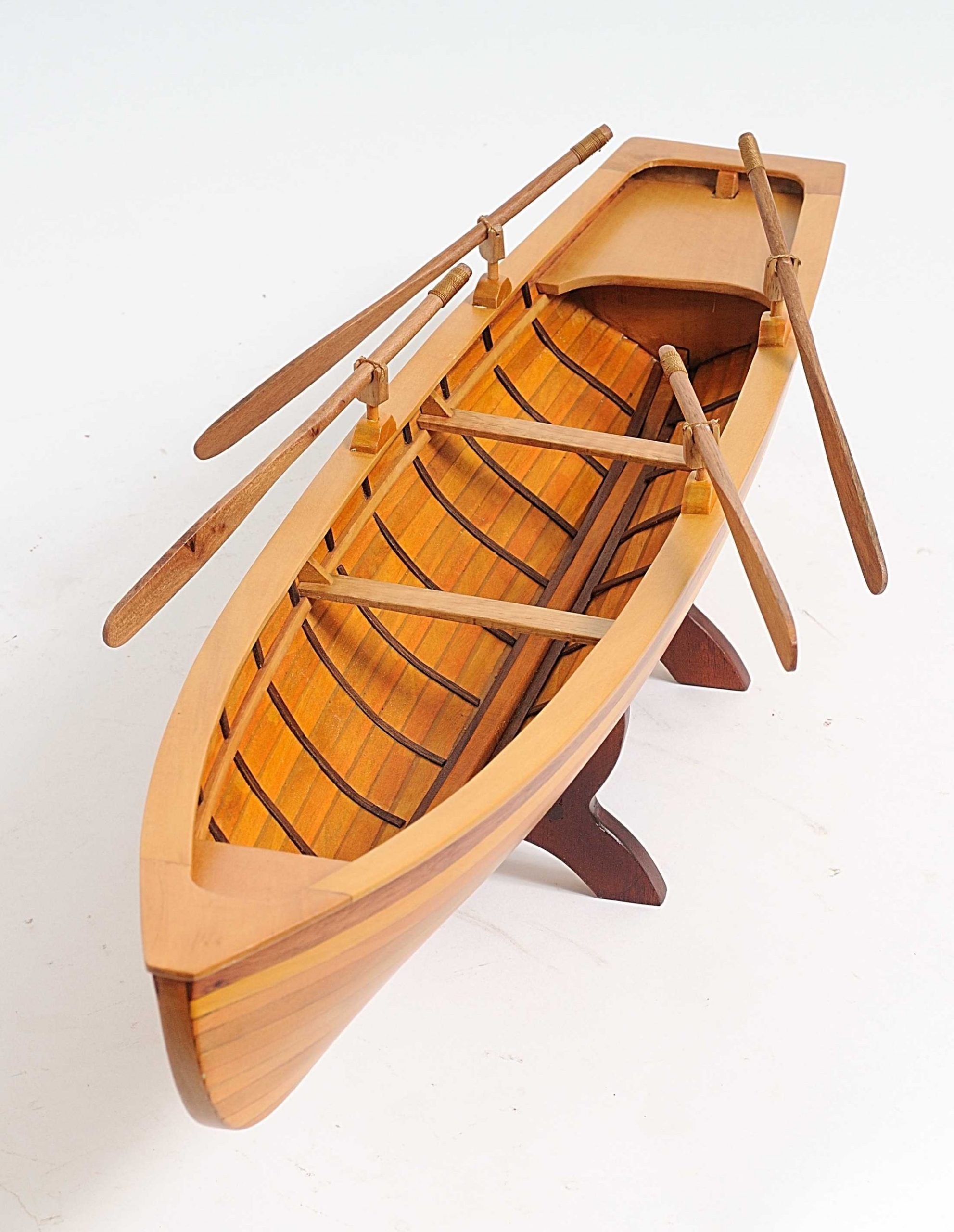 It is a FULLY ASSEMBLED replica of a Boston Tender, a classic rowing boat believed to have originated along the New York waterfront in the early 1800s. It looks and feels like a miniature real boat. This 24.5-inch model is strip built from the highest quality of woods by master artisans using plank on frame construction, just like real boats. Each model takes more than 50 hours to construct and undergoes a demanding quality-control process. Among the details of this boat model: interior ribs, four oars, oar holders, seats, brass nameplate and stand. The boat is wood, through and through!
