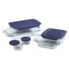 - Set includes 3 quart oblong dish, 8” square and 2 4.2″ cup round storage dishes with blue plastic covers