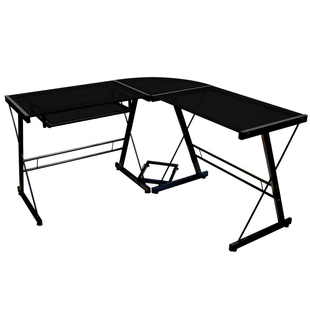 This Modern Corner L-Shaped Metal Glass Top Computer Desk offers a sleek modern design crafted with durable steel and thick tempered safety glass. The L-shape provides a corner wedge for more space and the design creates a look that is both attractive and simple. Flexible configuration options allow you to mount the keyboard tray on either side of the desk. Also included are a universal autonomous CPU stand and a sliding keyboard tray. This desk compliments any room and is a great addition to any home office.