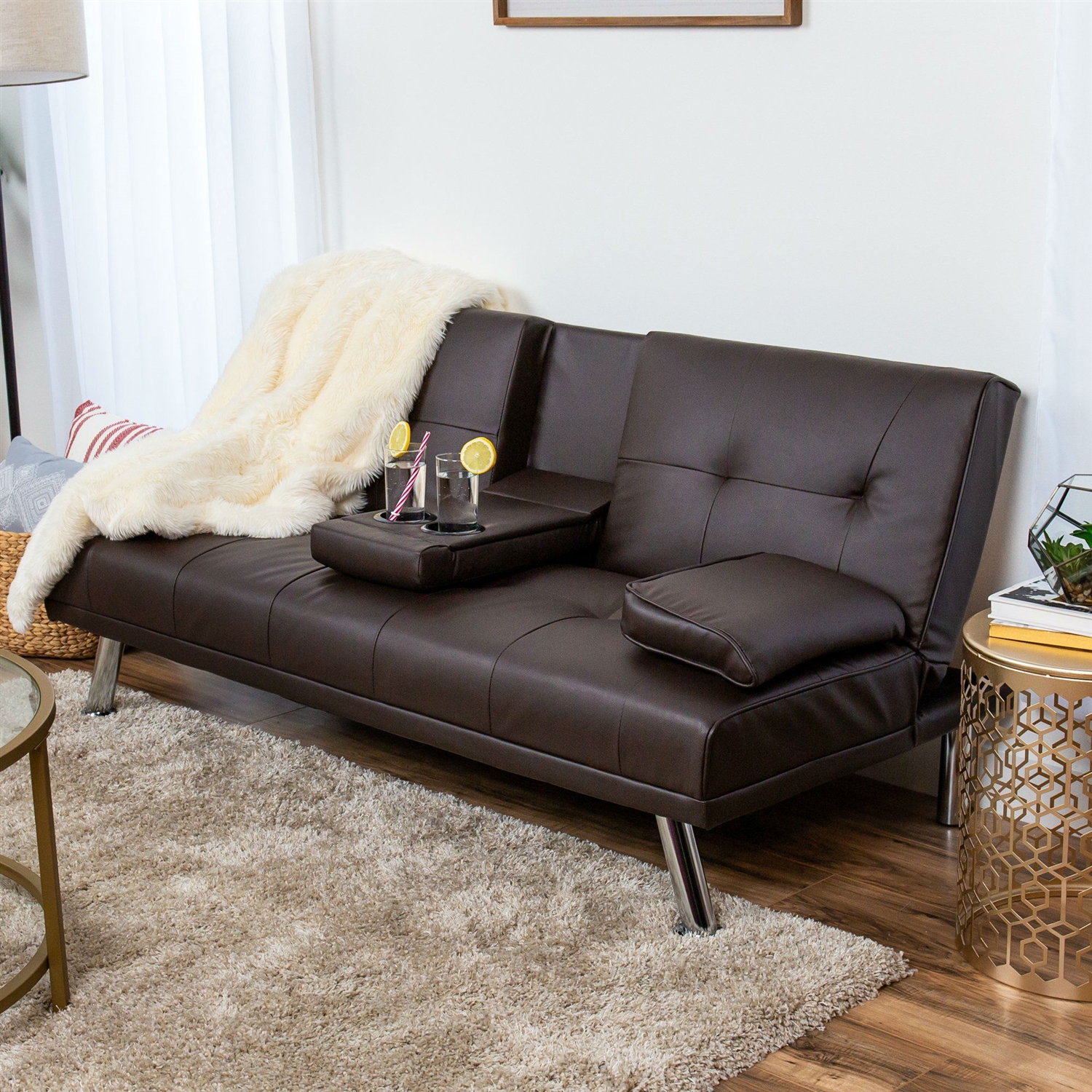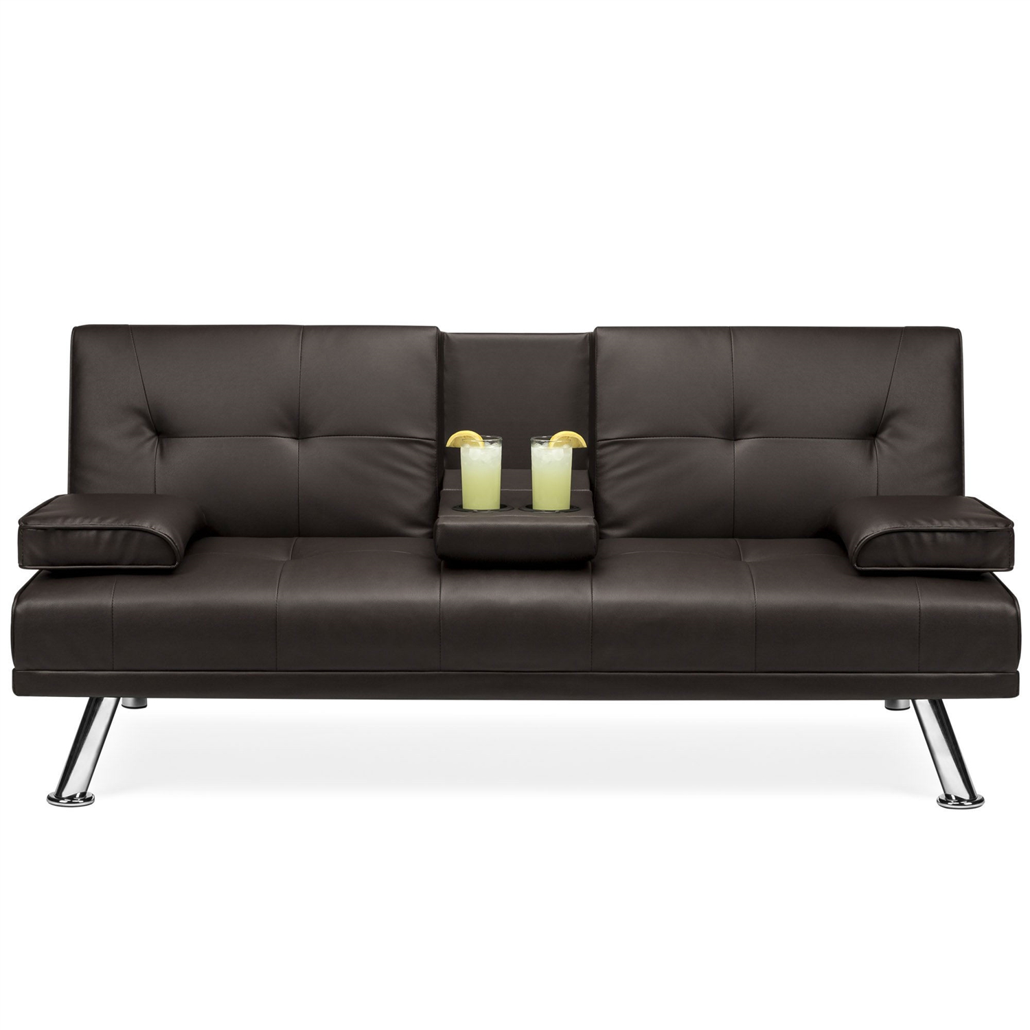 Brown Faux Leather Convertible Sofa Futon with 2 Cup Holders