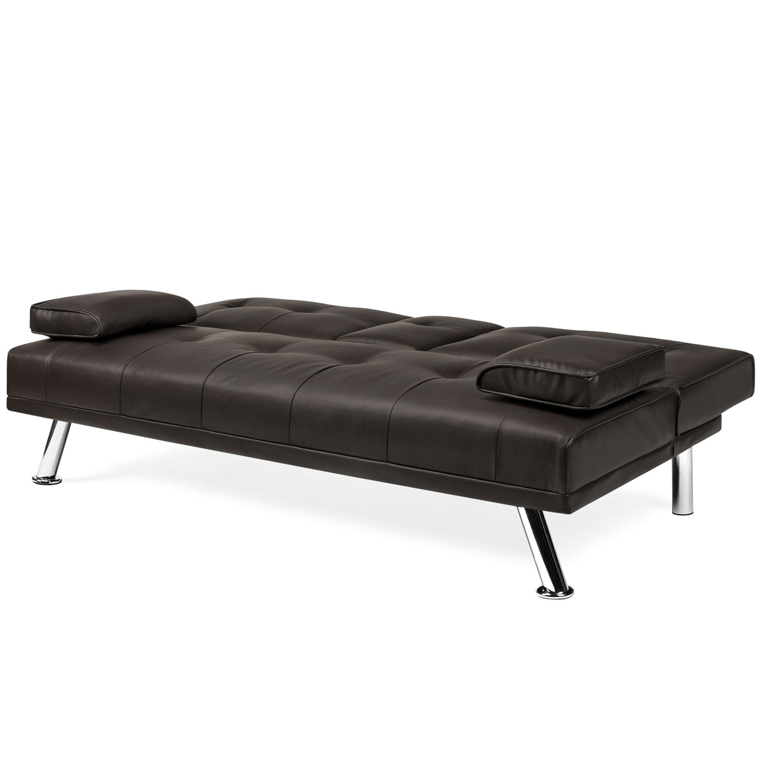 Brown, Faux, Leather, Convertible, Sofa, Futon, 2 Cup Holders