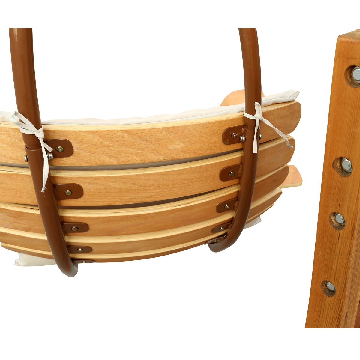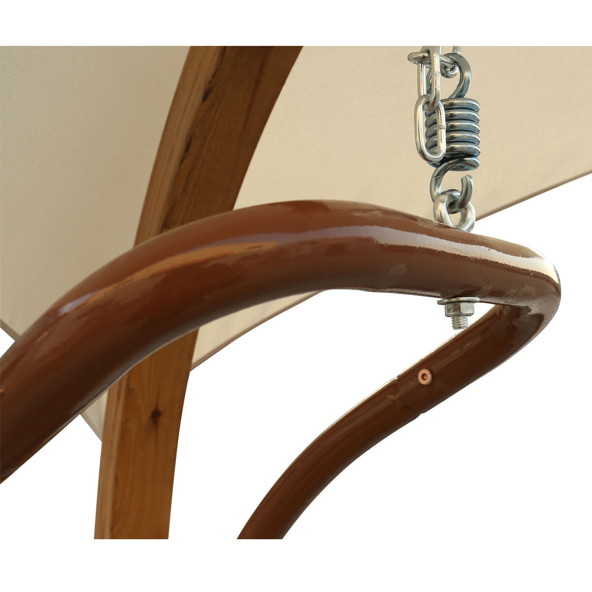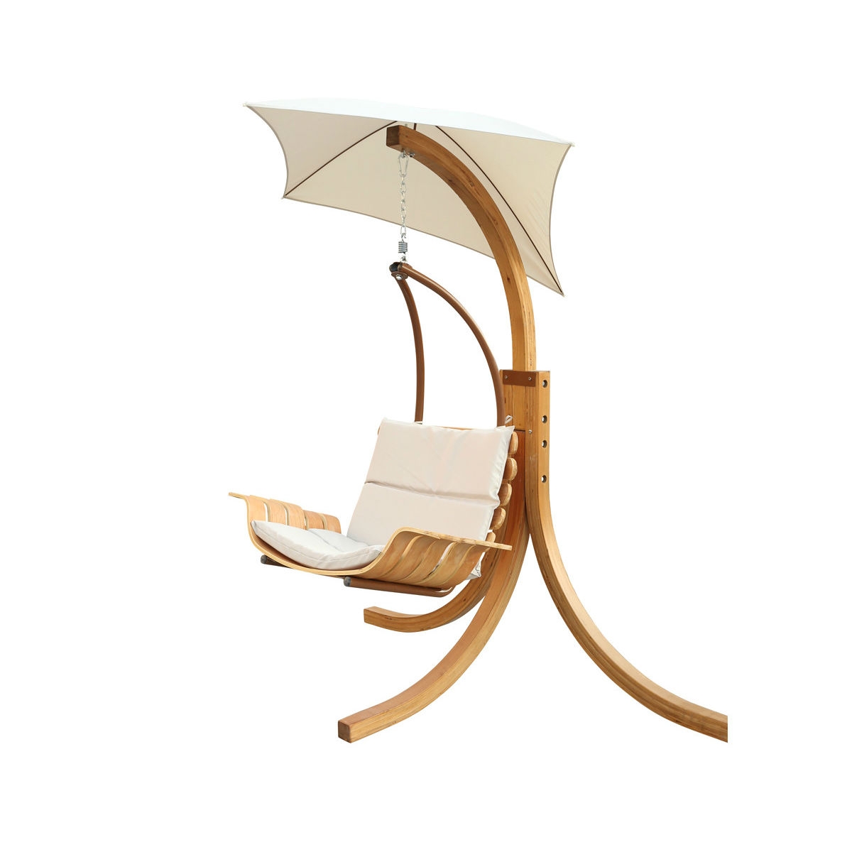 Contemporary Porch Swing Deck Patio Chair with Umbrella Color: Stained medium brown Crafted of solid larch hardwood valued for its tough, water resistant and durable qualities Finished with acrylic protective coating Outdoor seating that reflects a modern or classic mood Suitable for all outdoor spaces Ergonomic design that responds to your torso Protective finish provides built-in weather protection Water resistant Chair frame made from powder coated metal Rich craftsmanship shows through in the sleek, compact design Manufacturer provides 1 year warranty Durable, easy-to-clean polyester cushions Style: Contemporary Swing Finish: Brown Swing/Stand Set: Yes Cushions Included: Yes