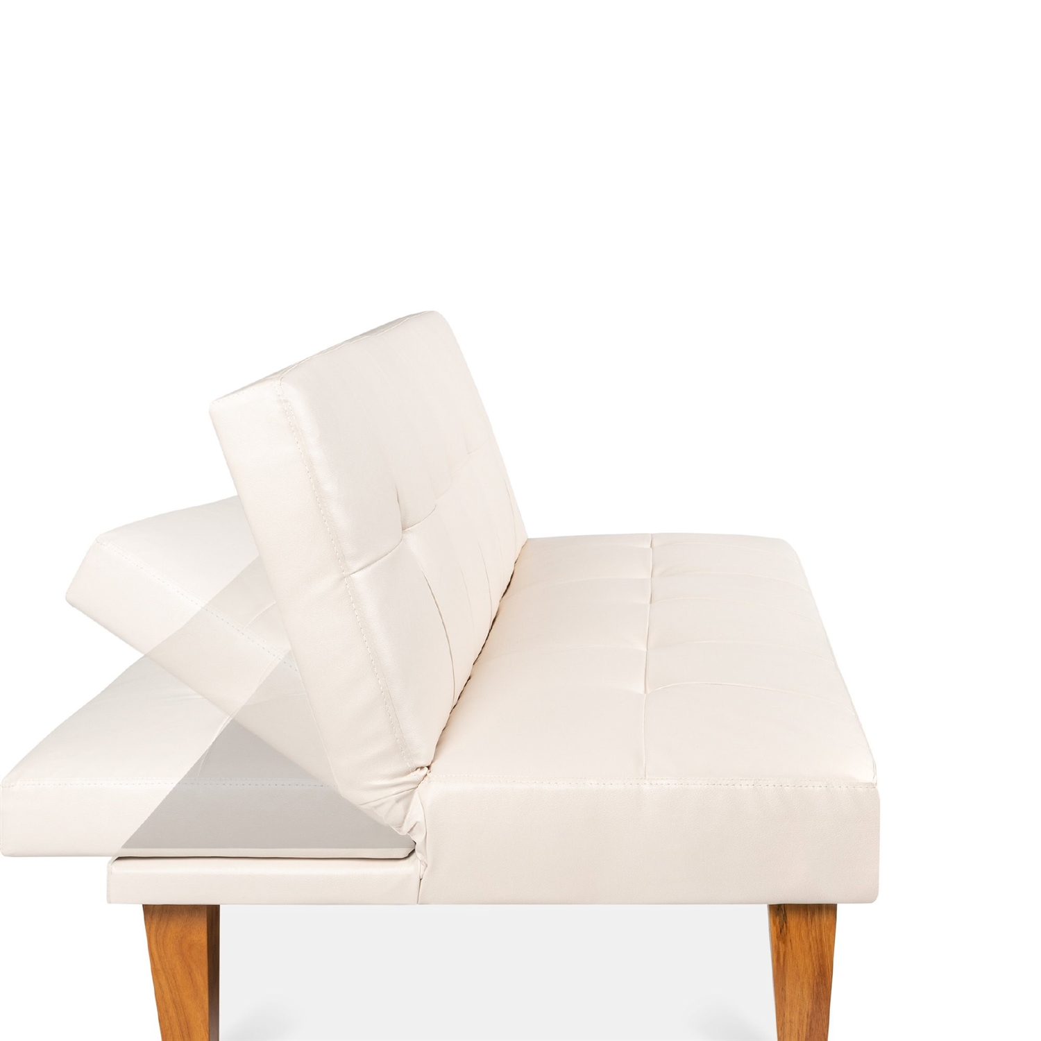 Sleek, tufted faux leather upholstery finished with clean lines and wooden retro legs look great in any setting with this Convertible PU Leather Tufted Lounge Futon Sofa Bed Adjustable Back in White. Go from deep meaningful conversations to watching the football game, and even counting sheep with three backrest settings fit for any occasion/s. Host your special occasion or get together in style with on this elegant couch that seat three people, up to 550 pounds. Easily goes between a sitting area to counting sheep with an ergonomic design fit for the modern living room, apartment, or dorm. Durably built with sturdy retro wooden feet, and elegant tufted design with PU leather for a sturdy modern sleep design.