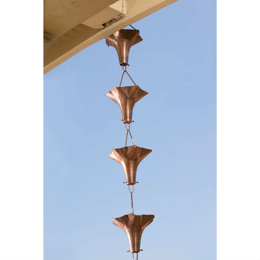 The sound of rain is so relaxing, people pay for CDs just to hear it. Well, forget the fake stuff, this Copper 8.5 Ft Flower Blossom Rain Chain Downspout uses real rain to create a low water sound for your front or back yard. Enjoy 8.5 feet of pure rain fall as water trickles from cup to cup. This rain chain is crafted from pure copper to withstand the wear and tear of outdoor weather.