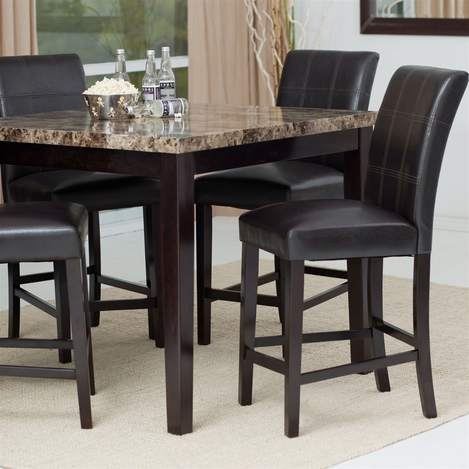 This Counter Height 5-Piece Dining Set with Faux Marble Top Table and 4 Faux Leather Chairs provides just what you need to enjoy a nice casual evening with the guys down in the game room. We can’t guarantee that the game will go your way, though. The tabletop is constructed from faux marble veneer, covered in a lacquer finish for protection. Finished in a rich dark espresso brown color, this solid wood table coordinates well with most decor styles. Four espresso faux leather chairs are included in the set.