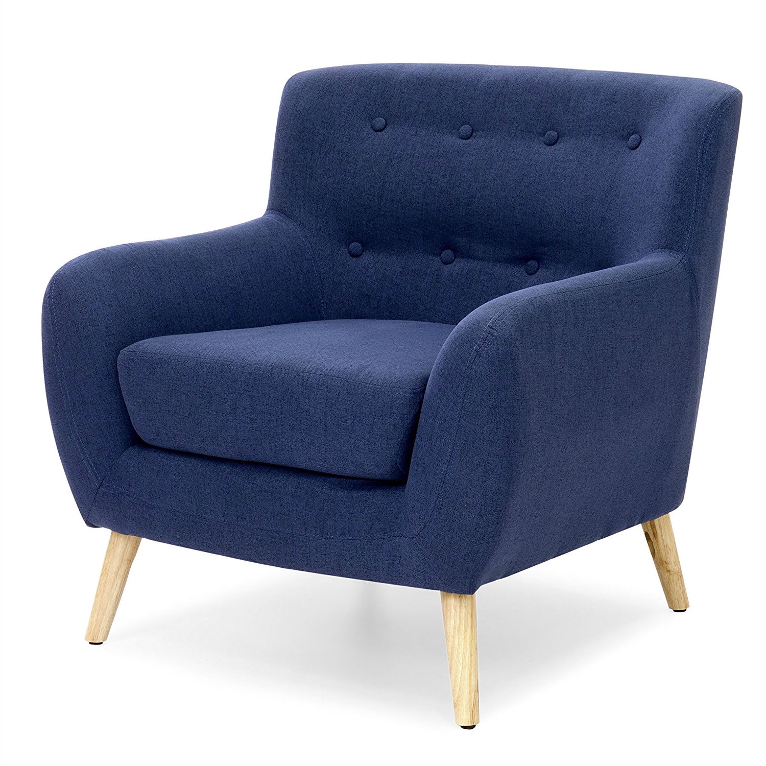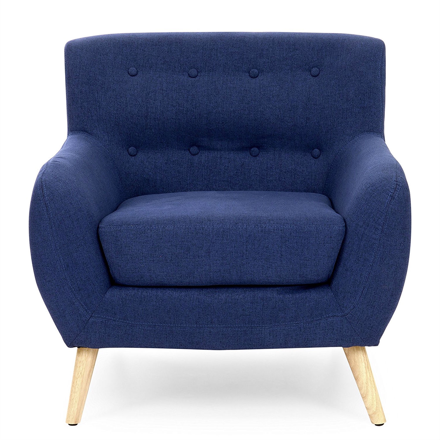 Dark Blue Linen Upholstered Tufted Armchair with Modern Mid-Century Style Wood Legs Mid-century style accent chair is an elegant furniture piece that will peak the visual interest of your guests Chair designed with a vibrant blue tone sure to add a new flair to any room’s décor A beautifully tufted backrest and thick seat padding adds a comfortable element to its soft linen upholstered construction Sturdy natural wood legs are angled and tapered from top to bottom to complete your chair’s chic appearance