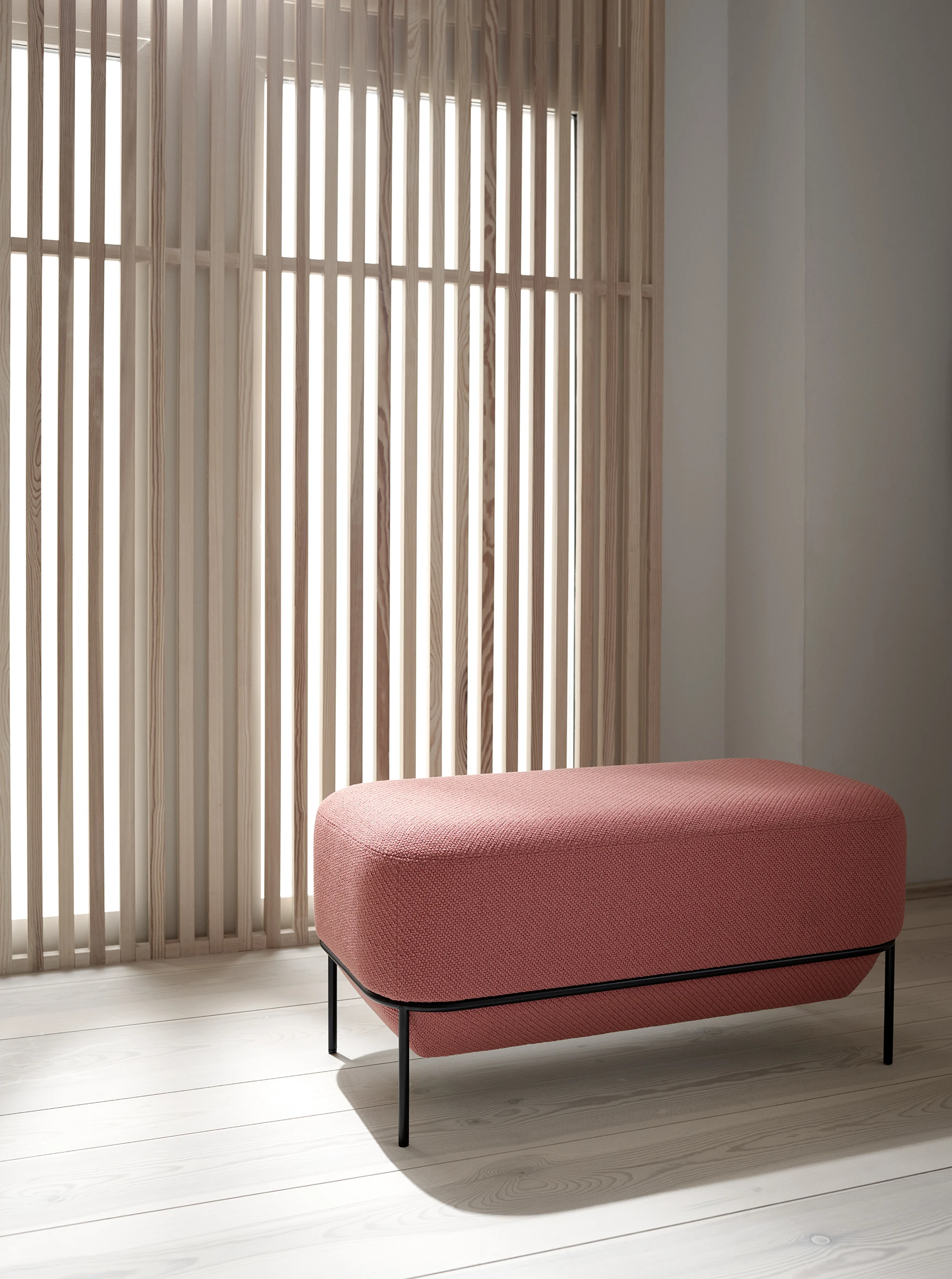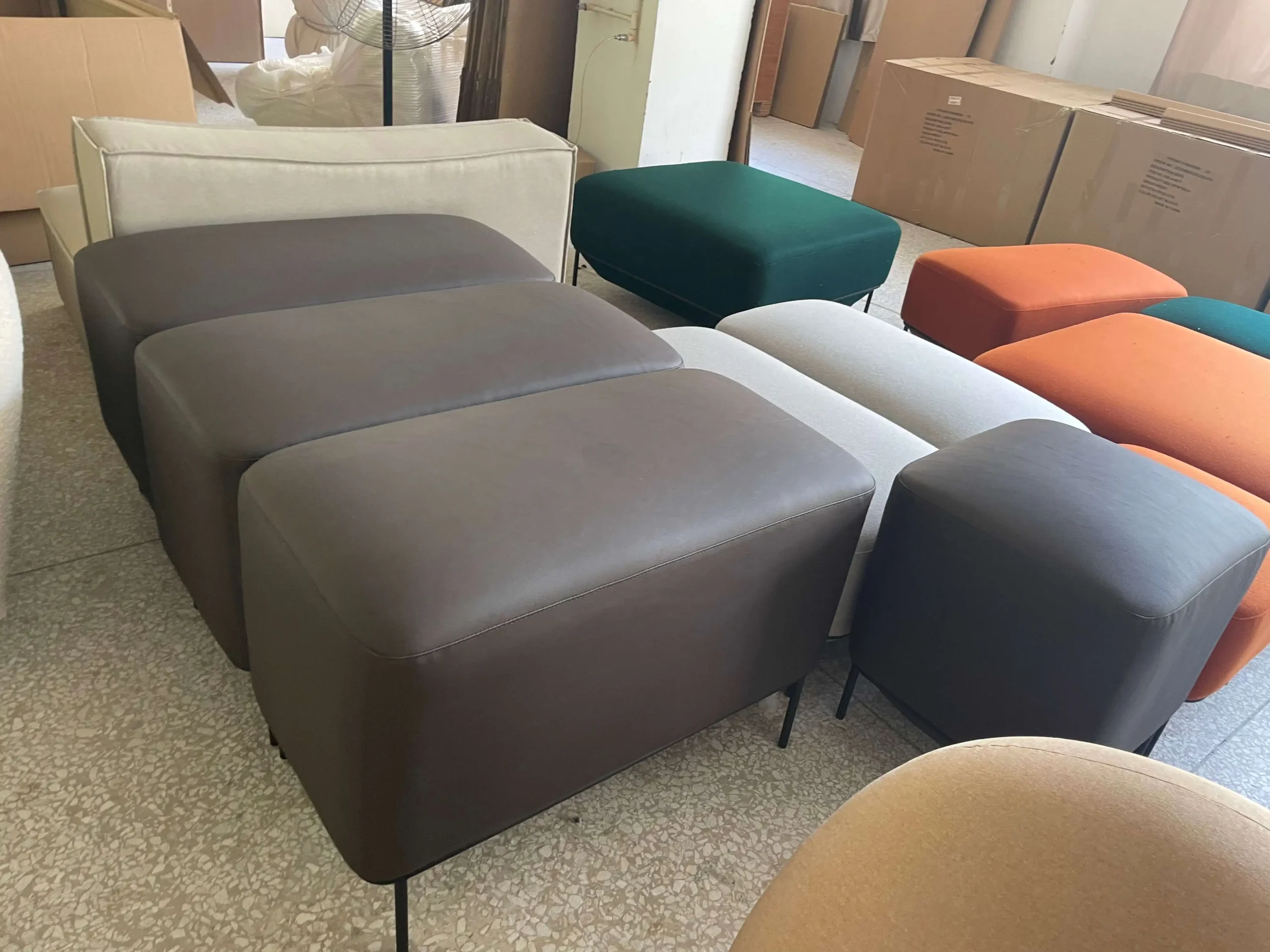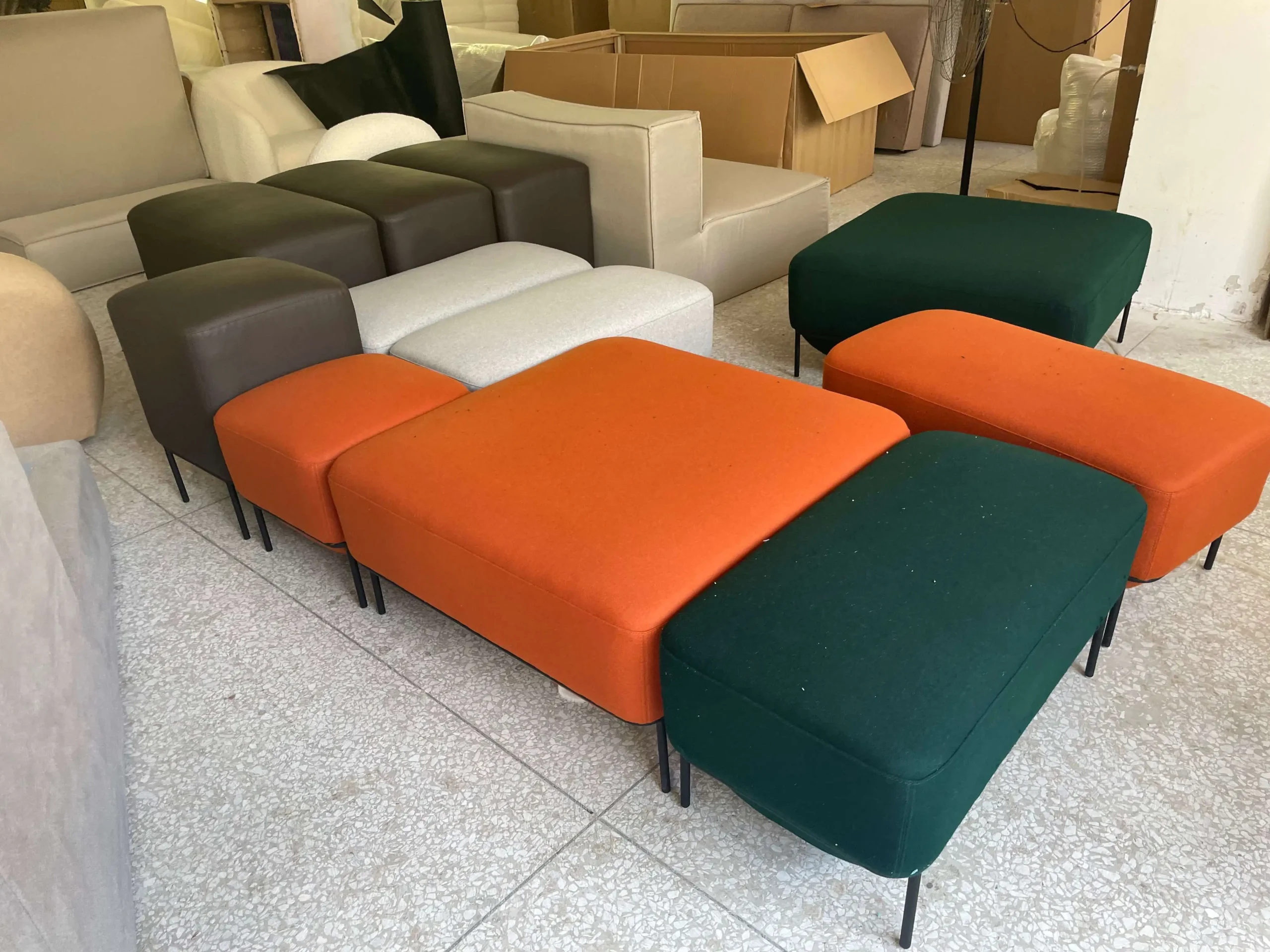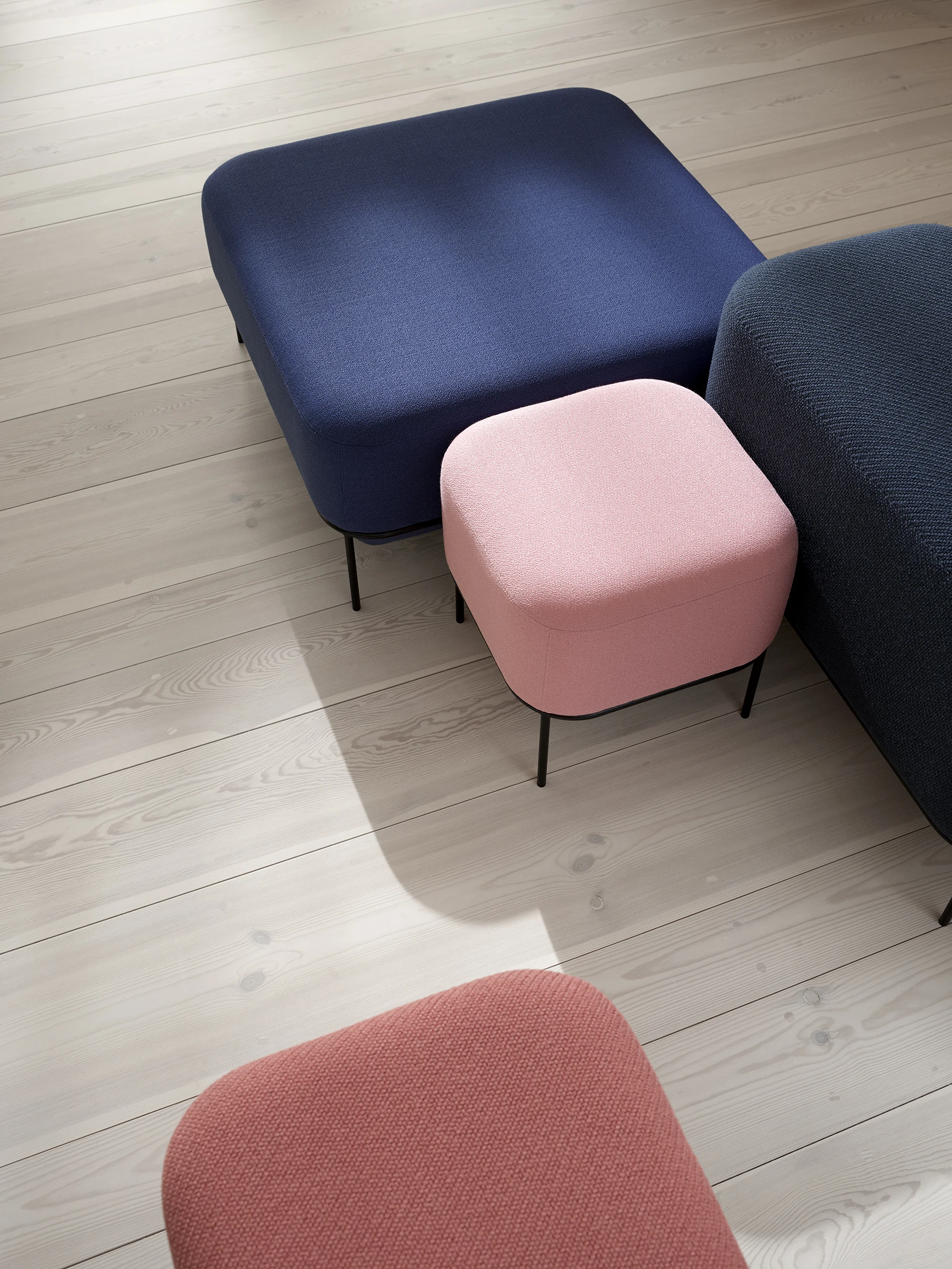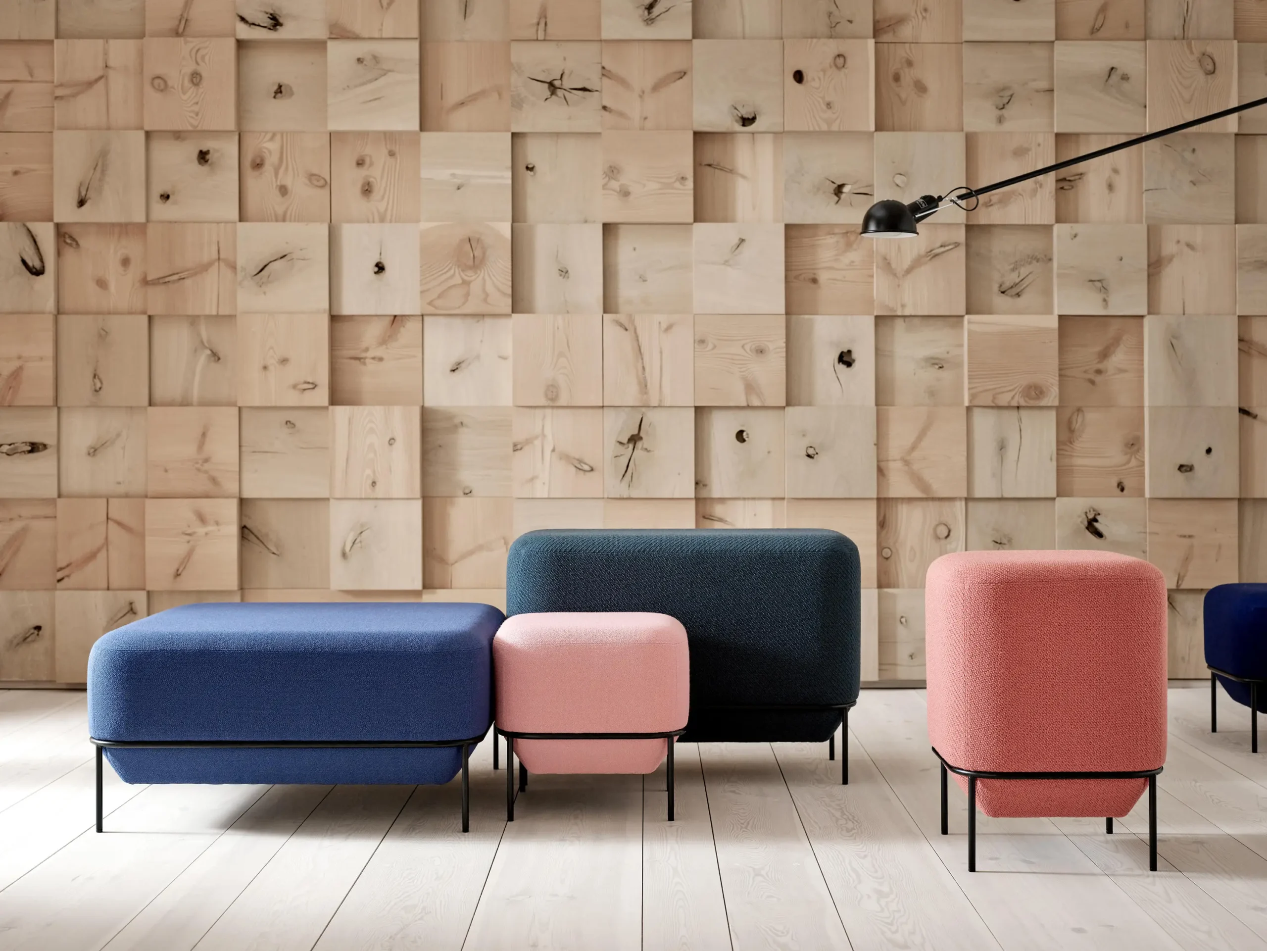 The Mozaik seating family is made up of three principal shapes. A small soft square stool and soft rectangular bench available in two heights an a large low soft square stool. The two heights of upholstered unit allow for different seating styles that in turn facilitate different patterns of behavior, function and interaction