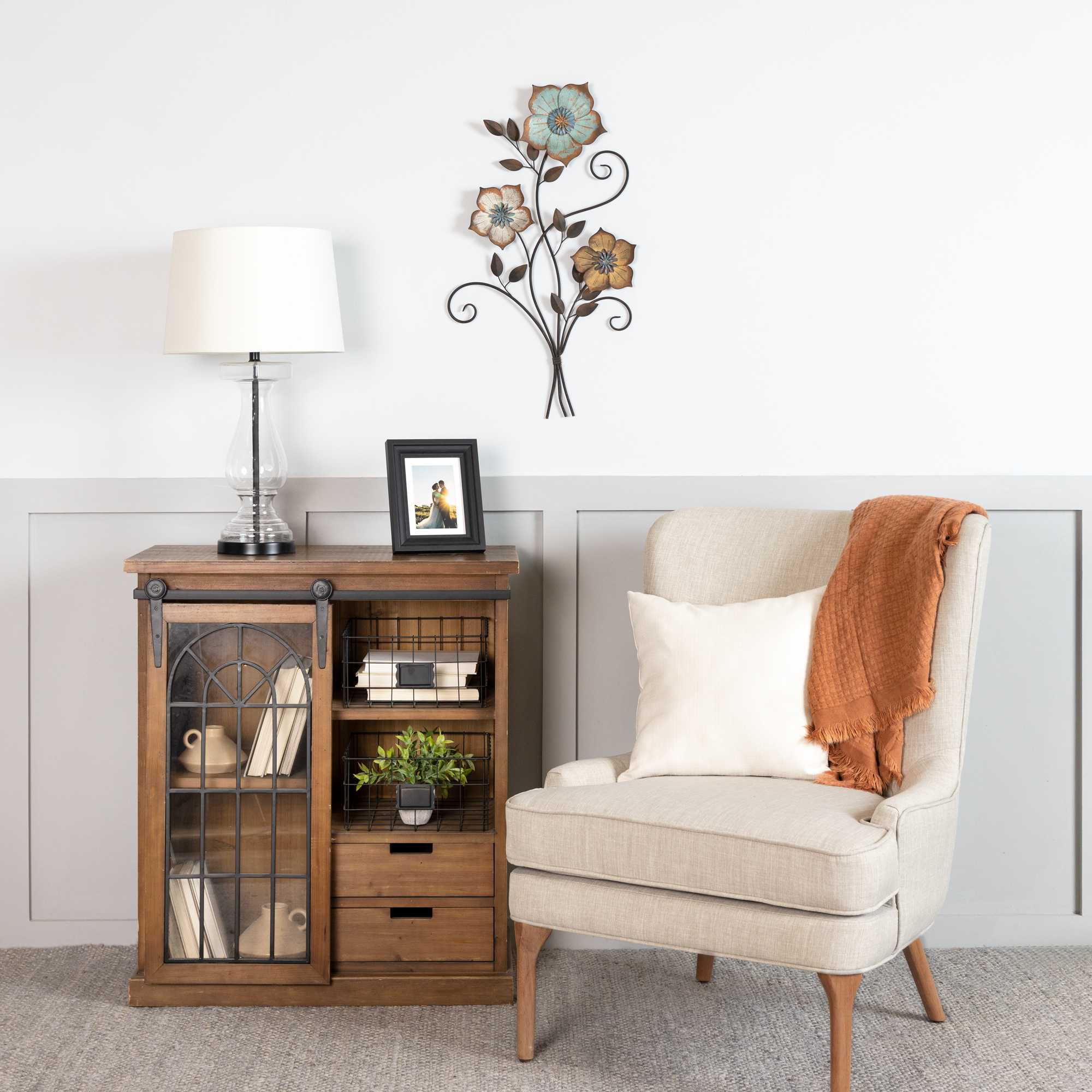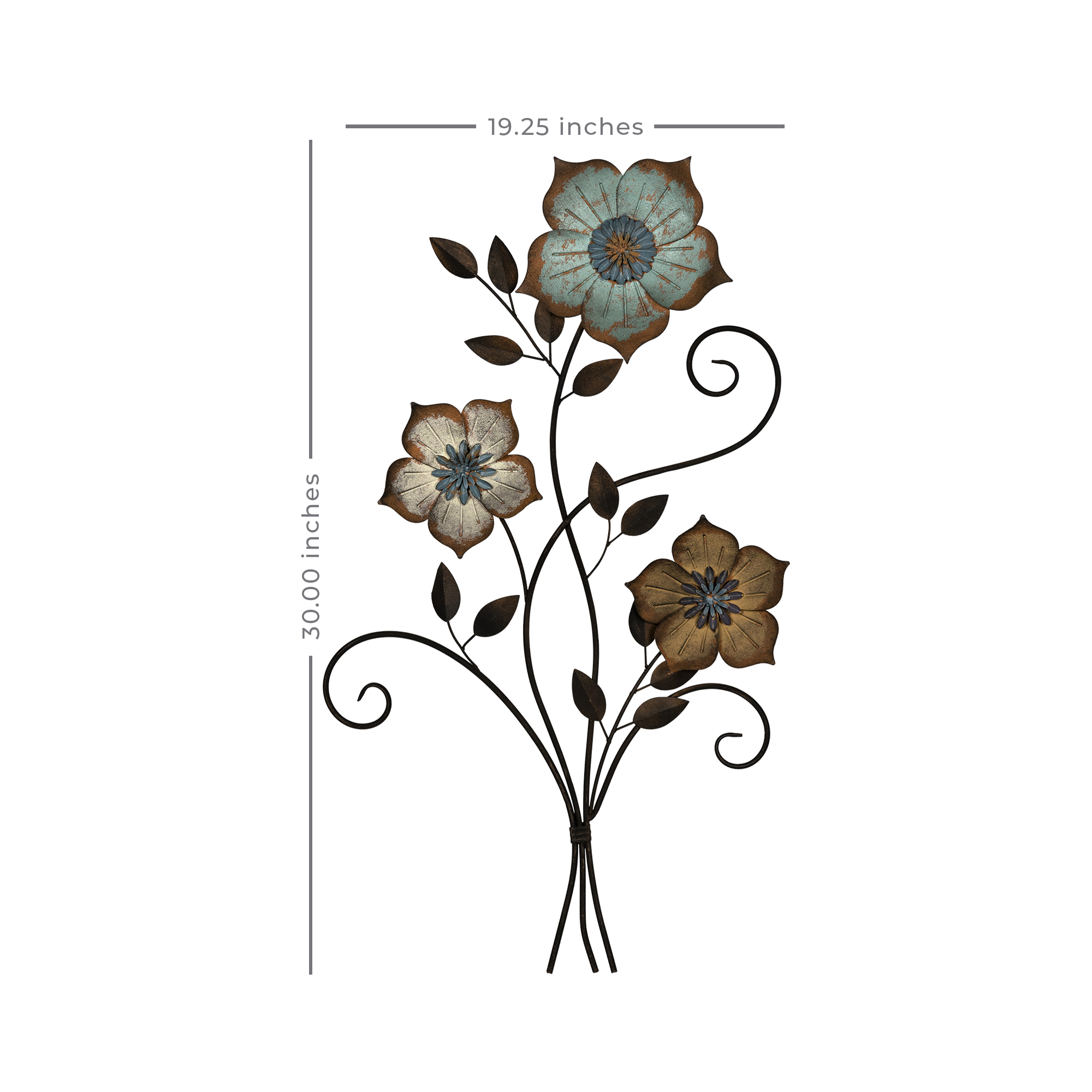 Give your interior a huge boost in style by adding this botanical piece to it. This handcrafted decoration features 3 curvy stems adorned with leaves, fully bloomed flowers, and a distressed finish which adds a rustic and natural touch to your home.