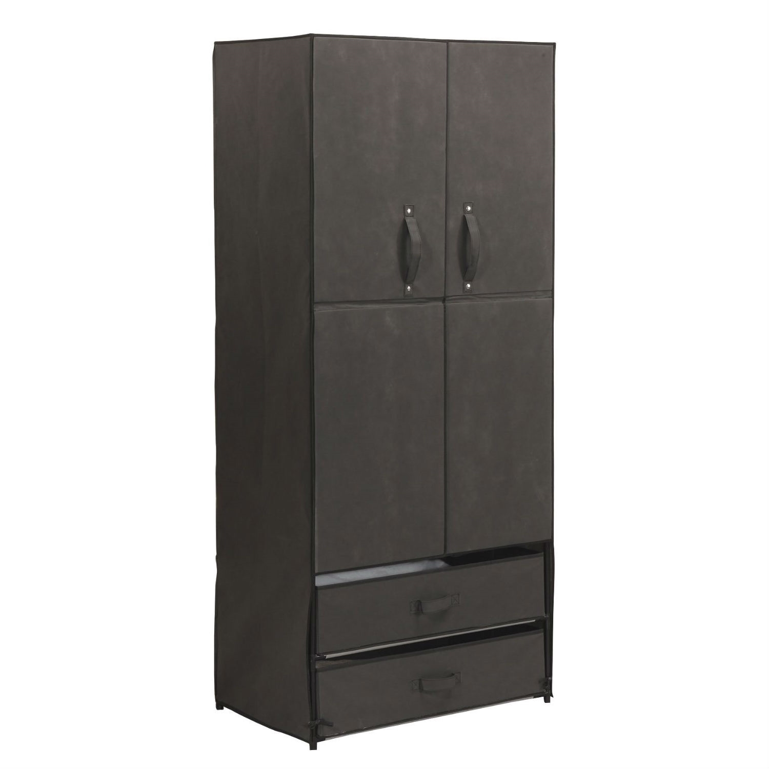 Customize this Durable Steel Frame Wardrobe with Canvas Sides with magnetic doors to meet your needs. Two doors feature easy-open handles with secure-close magnets. Inside, you’ll find 2 shelves and a 27″ L hanging rod. Below the doors are 2 handy drawers that can be removed to make shelves — you choose! Sturdy steel frame with dark, neutral canvas complements any decor and is easy to wipe clean. This portable wardrobe is perfect for bedroom, guest room, laundry area and more! 68″ H x 17 7/8″ W x 28 3/4″ L overall. Drawers each measure 27 1/2″ L x 17 1/4″ W x 6 3/4″ H. Shelves are 27 1/4″ L x 17″ W x 3/4″ H.