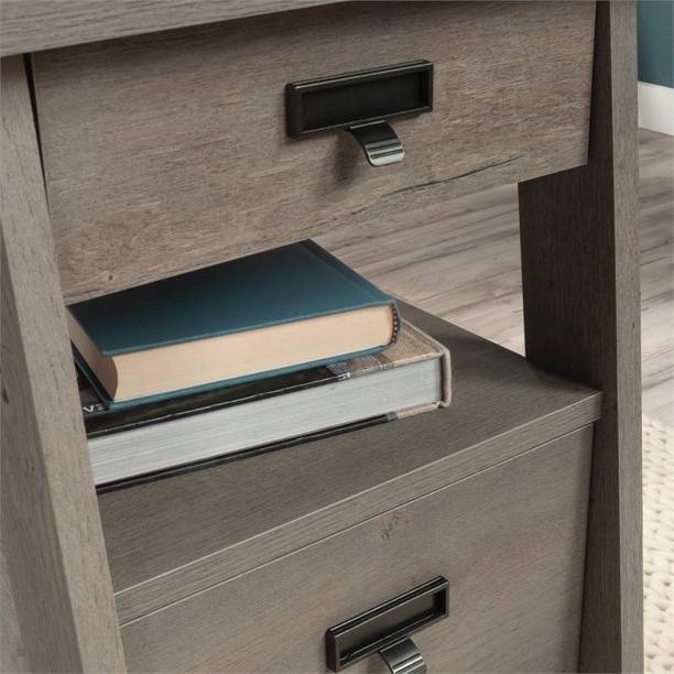 This FarmHouse Light Oak Executive Desk w/ Filing Cabinets Storage offers a spacious top surface that provides you with all the room you need for your must have desk essentials like your laptop, a cup full of pens, stacks of notepads and your favorite coffee mug. You can even find space for home décor items like an accent lamp and picture frames too. This computer desk features 2 small drawers that open and close on smooth metal runners for easy access storage of supplies. It also includes 2 file drawers with full extension slides to hold letter-size hanging files. Other features include a grommet hole for cord access so you can keep all your wires neat and out of the way.