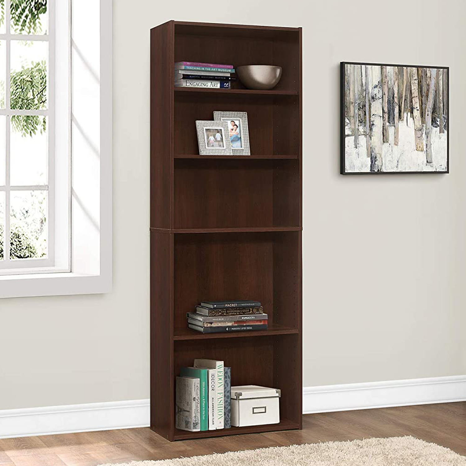 This 5-shelf bookcase in a simple, clean and space-saving design makes it a versatile storage option for any room in your home. The strong adjustable shelving allows for various sized objects to be displayed in your own creative way. Constructed from engi