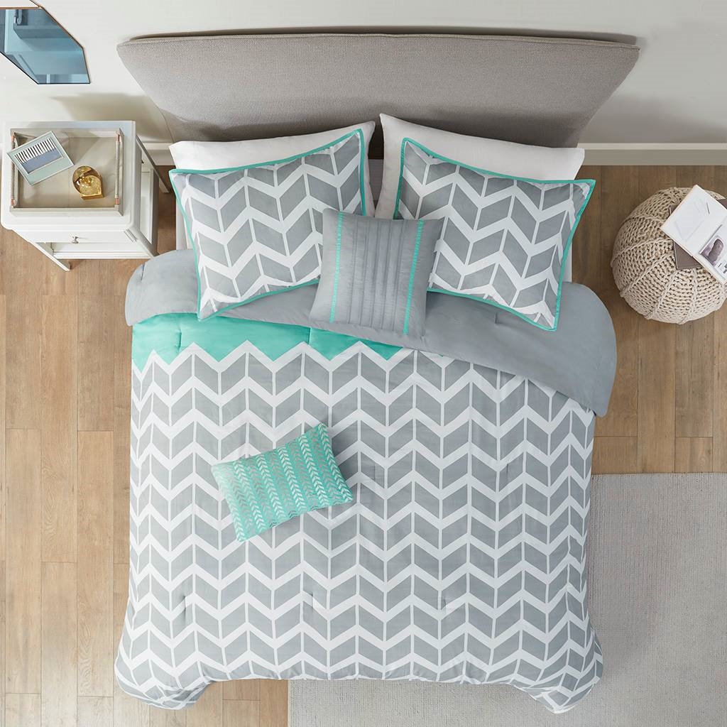 - Full/Queen Reversible Comforter Set with Grey White Aqua Teal Chevron Pattern