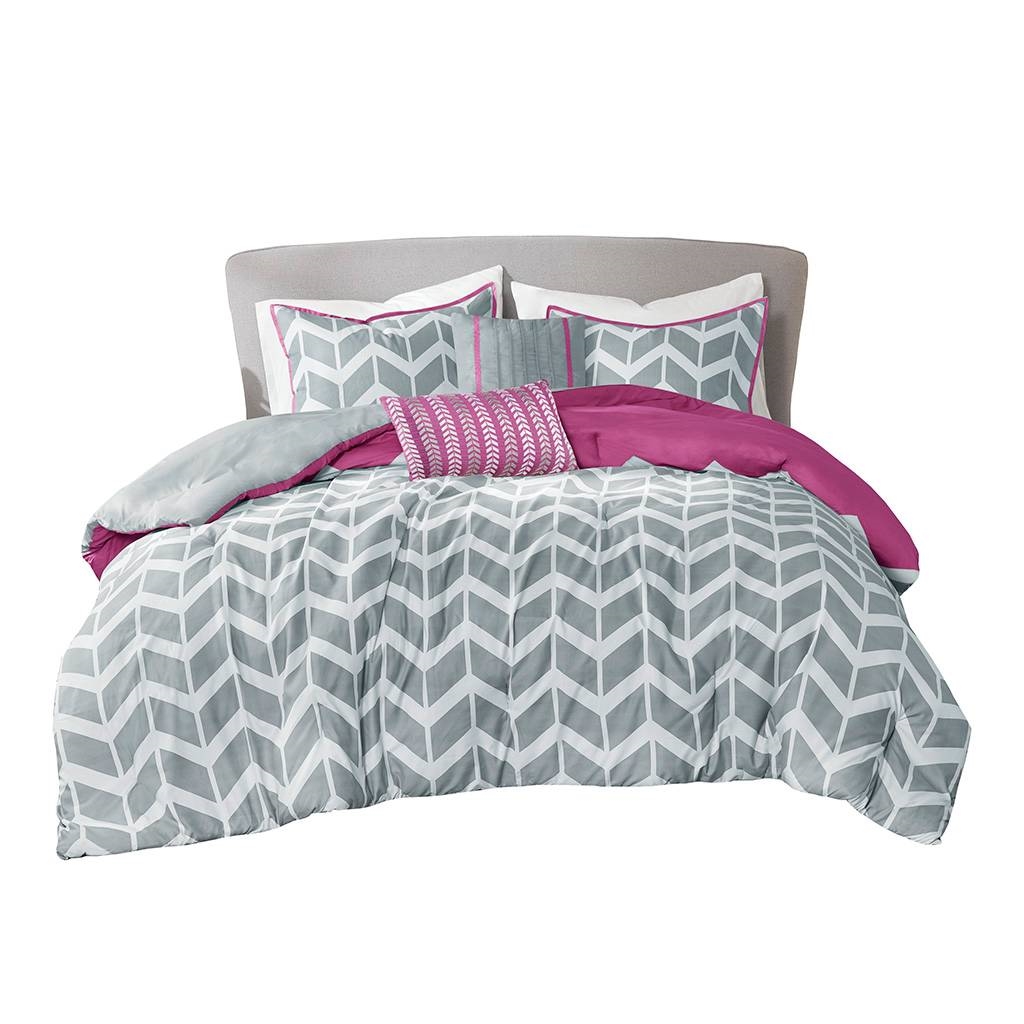 - Full/Queen Reversible Comforter Set with Grey White Purple Pink Chevron Pattern