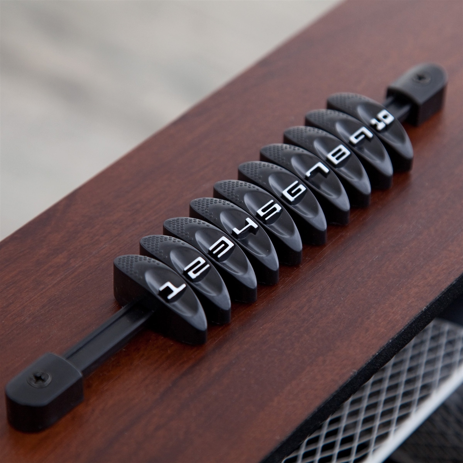 - Features a black laminate field