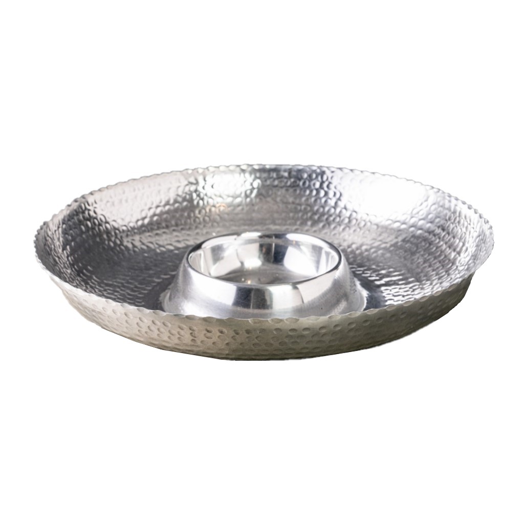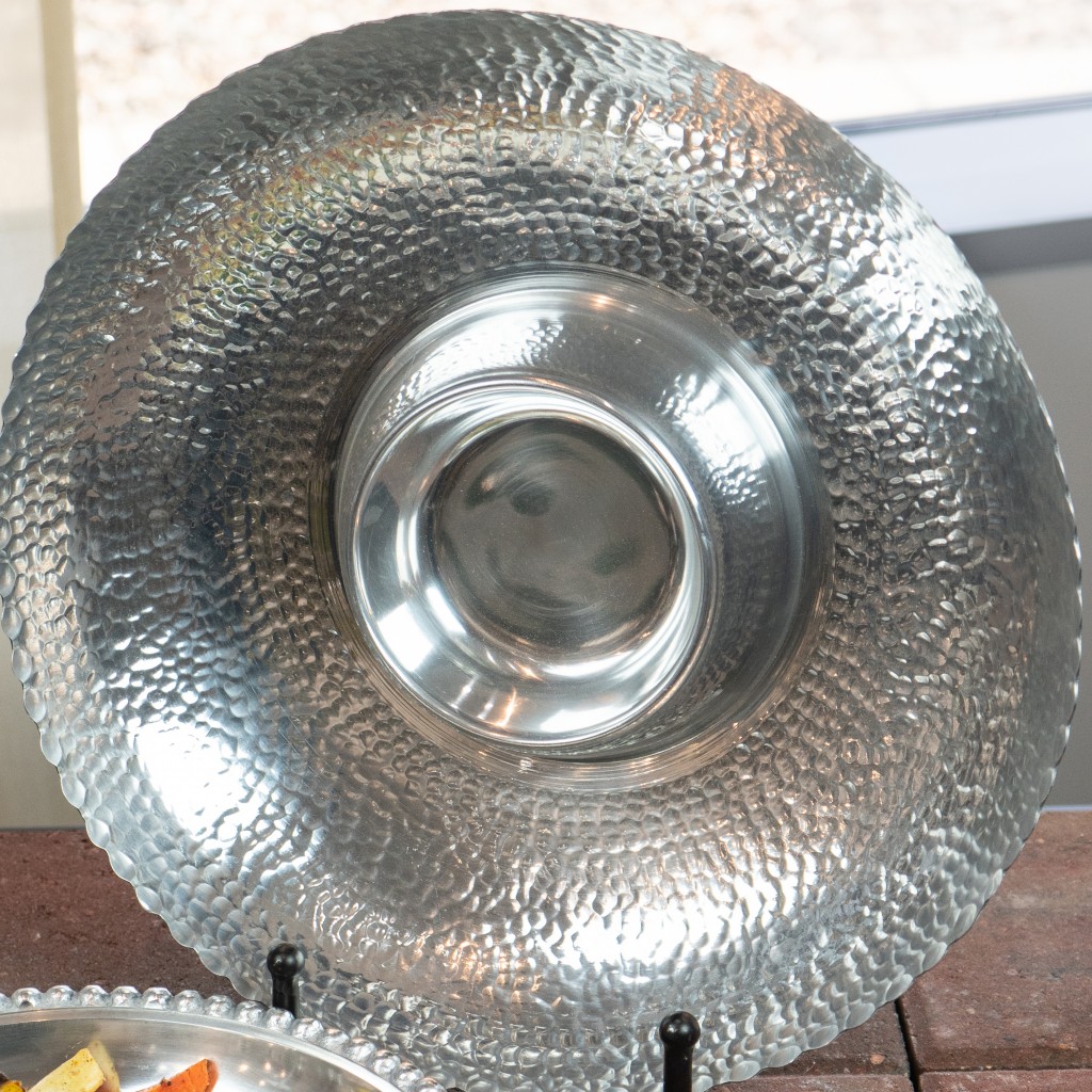 A gorgeous and functional work of art, this Handcrafted Hammered Stainless Steel Chip and Dip Server is the perfect server for your next get together. Utilizing a labor-intensive hand hammering procedure this round server with scallop fluted edges has a center dip well in smooth stainless that will be great centerpiece for serving. Dress up your table or bar area with this fun server.