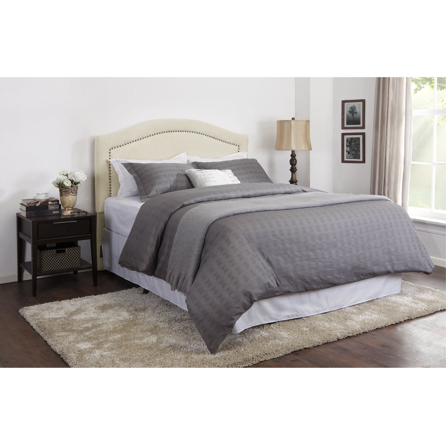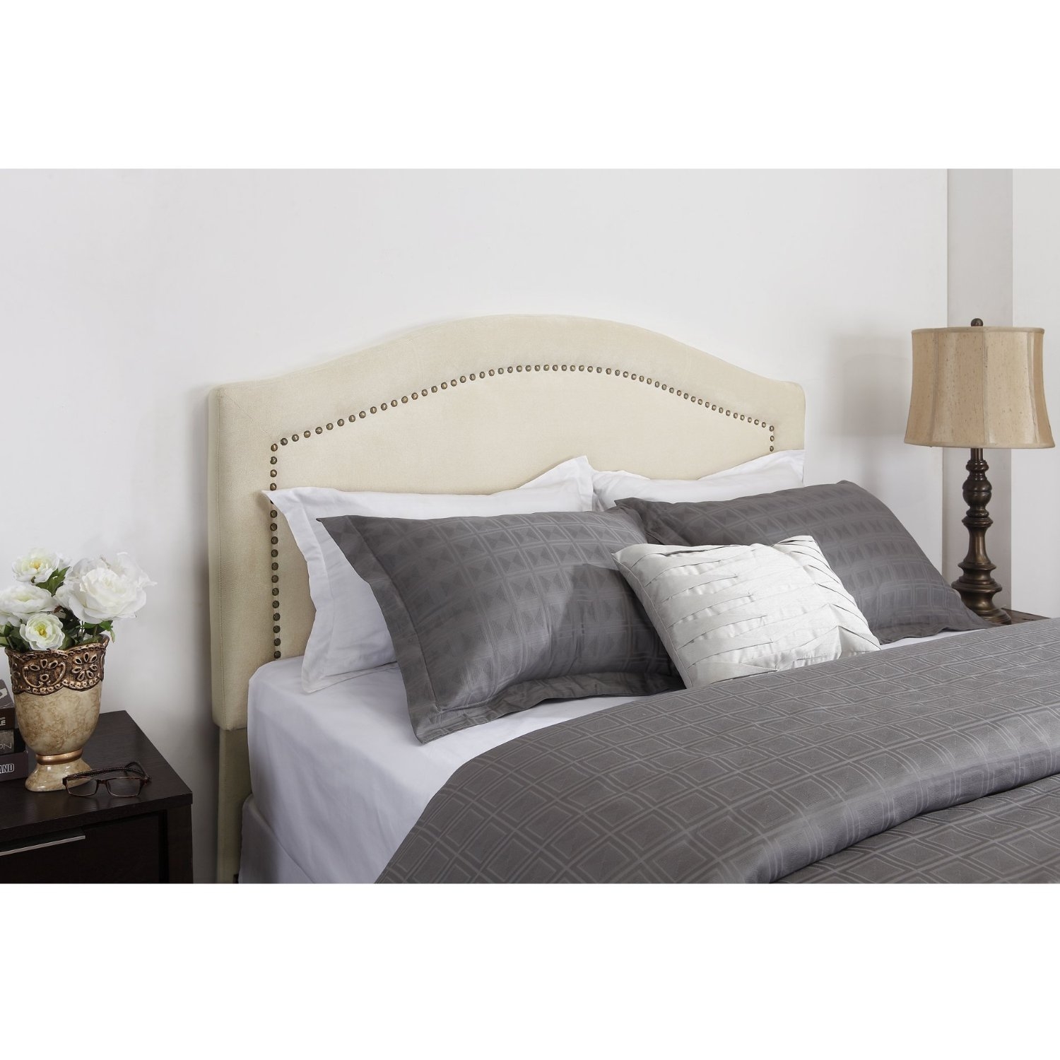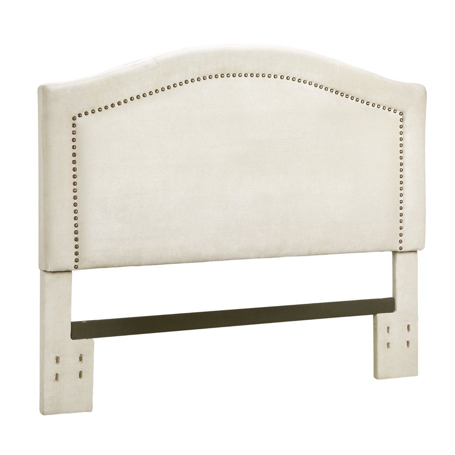 This King size Padded Upholstered Headboard with Nailheads in Linen Color is a beautifully upholstered piece, covered in a soft woven look polyester fabric. The camelback design, with its softly curved lines, is tastefully accentuated by the row of individually set nailheads. The brass-colored nailheads are inset within the welt detail of the headboard, setting off the silhouette and complementing the soothing Linen colored fabric. The sturdy wood frame, finished upholstered back and overall exquisite detailing will ensure the timeless essence of the Headboard with Nailheads.