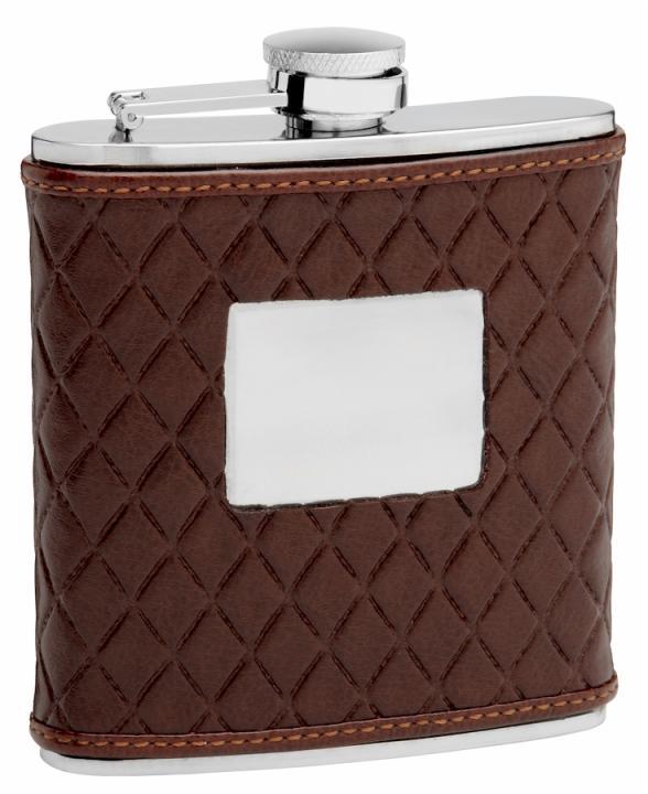 nThis is a standard size 6oz hip flask. The deep brown leather with embossed quilted pattern give this flask an elegant and sophisticated look and feel. The high quality leather combined with the high quality stainless steel and personalization make this the perfect gift that doesn’t look or feel cheap. The primary benefits of this flask are: