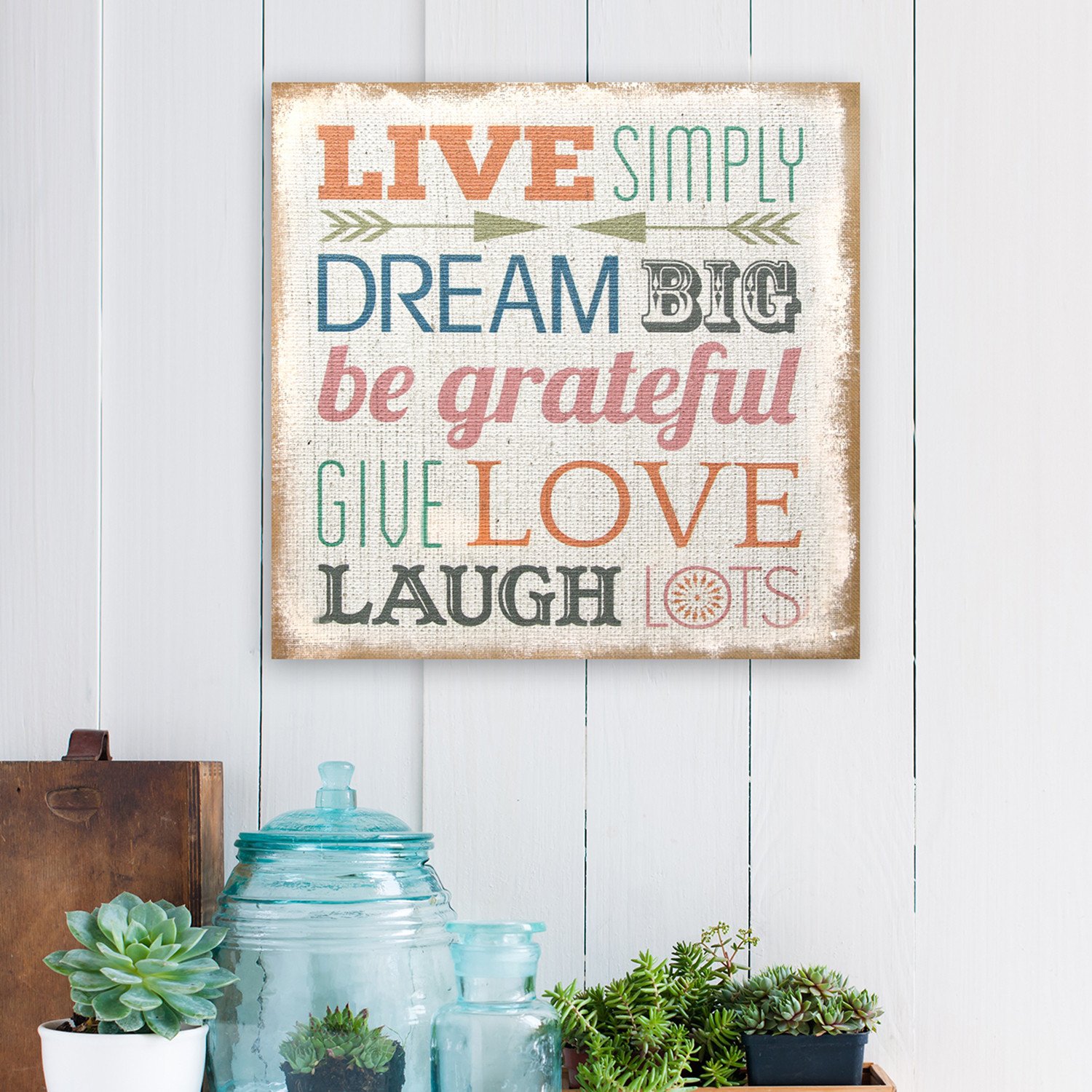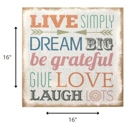 The hand-crafted and charming Live Simply Dream Big Wall Art is a great way to add a positive message and vibe to your kitchen, living room, hallway, or family room. The positive sentiment, ” Live simply, dream big, be grateful, give love, laugh lots” is featured on this square wall plaque in a pretty and neutrally perky color palette that is designed to look like it is on a background of burlap. 16″ X 16″ X 1.5″