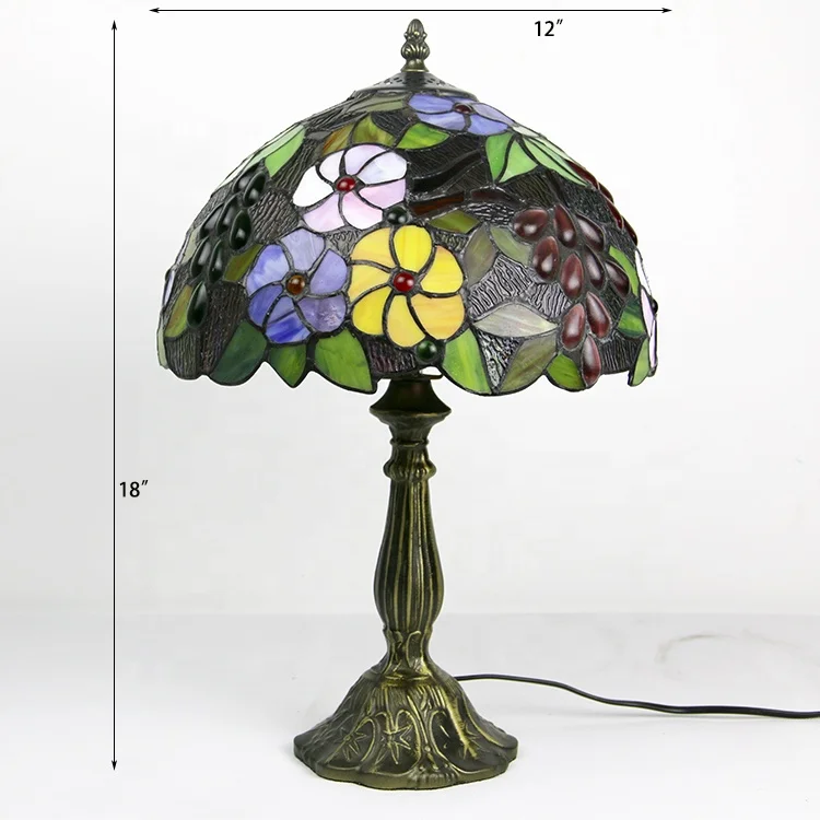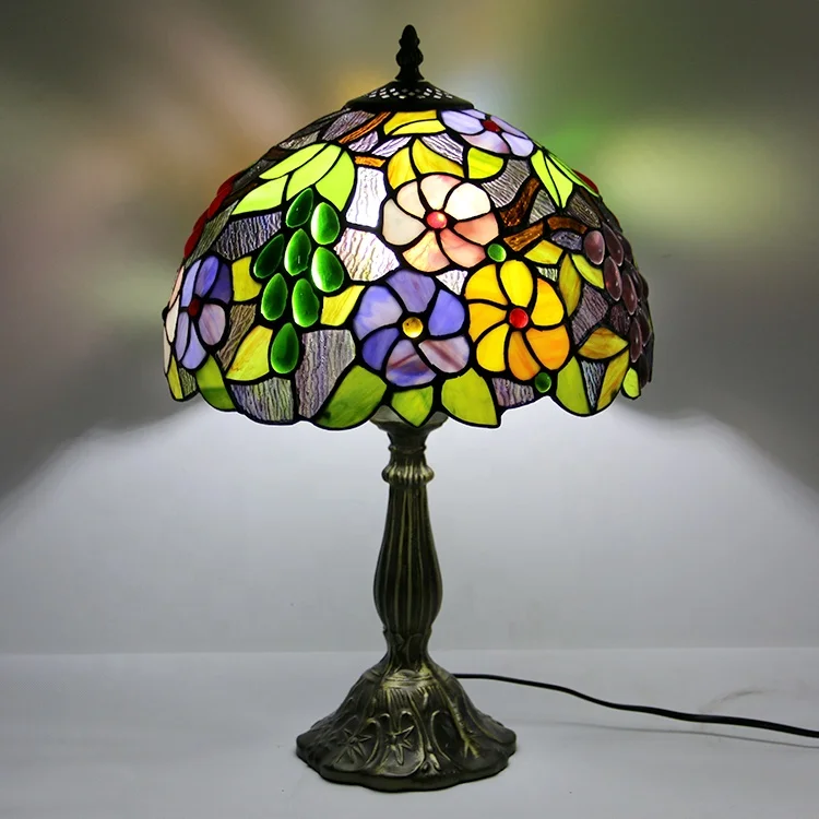 LongHuiJing 12 Inch Tiffany Style Table Lamp Stained Glass Grape&Daisy Pattern Desk Lamp Shade