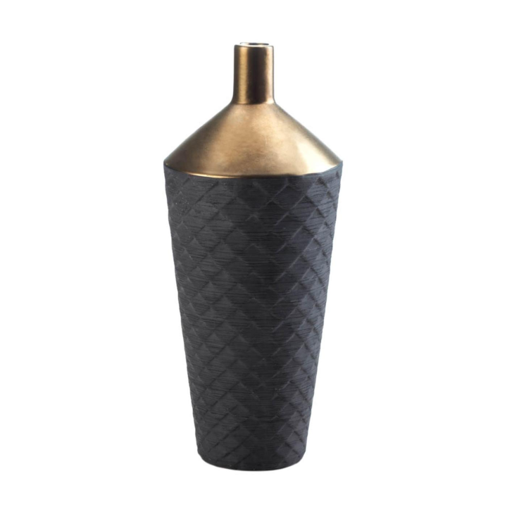 The Lucca Black and Gold Vase offers a masculine design with an antique gold top and matte black base that will look striking on its own or with a single flower on display. Antique gold finish on top. Matte black diamond pattern textured base. This vase measures 7″ in diameter and 15″ tall. Wipe with a damp cloth when needed. Weight 3.40 lbs. 7.00″ x 7.00″ x 15.00″. Porcelain. UPC Number: 849179039493.