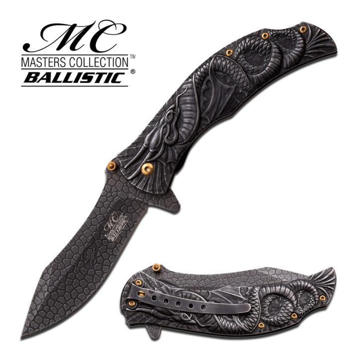 nOur newest addition for the fantasy knife collector is a fully functional dragon knife. The details of a dragon are practically sculpted into the handle and on the blade details are made to that of the dragons scale. While this knife is functional and the blade is as sharp as a dragons talon who would want to mar the blade with use. Each knife is so beautifully crafted you will want to own them all.Color Options are:STONEWASHED BLACKMIRROR STAINLESS STEELBLUE GOLD RAINBOWFeature overview:n 3.75″ 3MM THICK BLADE, STAINLESS STEELn ETCHED TITANIUM COATED BLADEn 4.75″ CLOSEDn DRAGON SCULPTURED TITANIUM COATED STAINLESSn HANDLEn INCLUDES POCKET CLIP