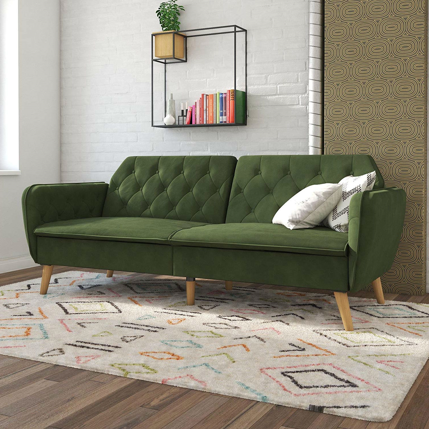 - Memory Foam Futon Sofa Bed with Green Velvet Upholstery and Wood Legs