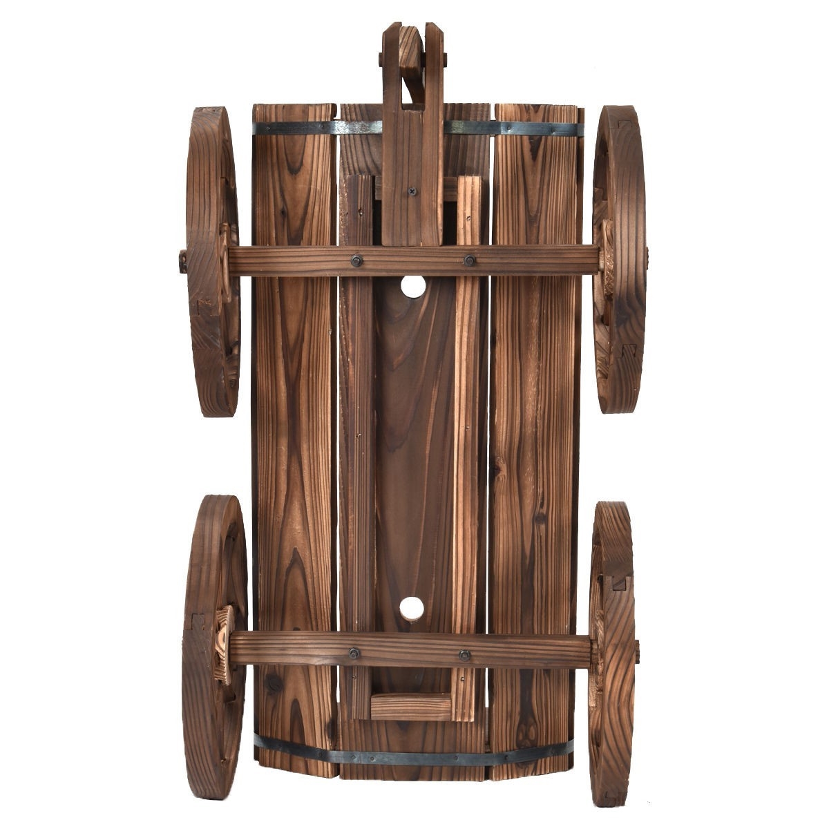 Mobile Half Barrel Solid Wood Planter Box on Wooden Wheels High quality and brand new A kind garden planter for planting flowers and plants With a rustic design and antique look, a decoration to the outdoor living space Solid Fir wood construction, sturdy and durable With four wheels for easy moving Wide enough to hold your planters Material: Fir wood Package include: 1 x Wooden wagon cart