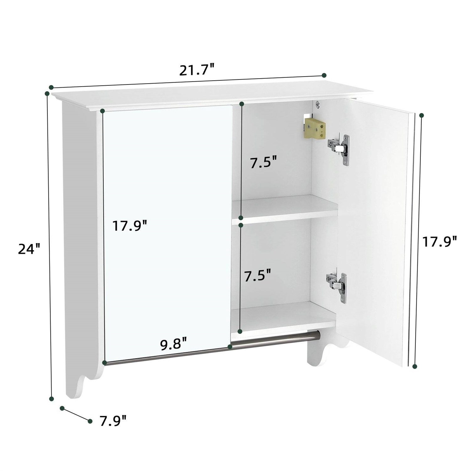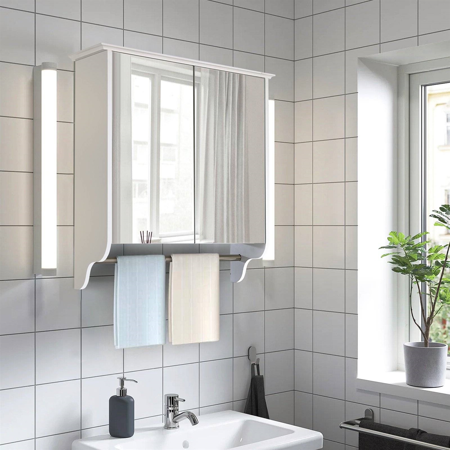 - Color: White sides, Mirrored doors, Steel towel bar