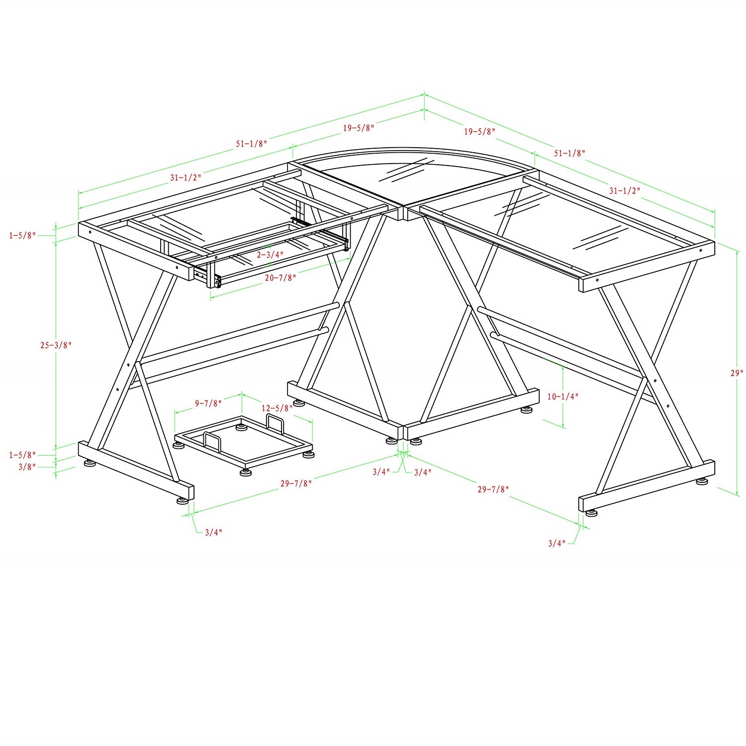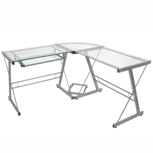 Architectural in styling and unmistakably modern, this Modern Corner Computer Desk in Metal and Glass provides ample workspace without weighing down the room. Durably fashioned from powder-coated steel tubing and tempered safety glass, the desk has an L-shape that fits neatly into corners and makes working more efficient. A sliding keyboard tray can attach to either side of the L, and a separate CPU stand is also included. Measuring 51 by 29 by 51 inches, the piece ships ready to assemble and coordinates with numerous Walker Edison TV and video stands for a fully coordinated home media room.