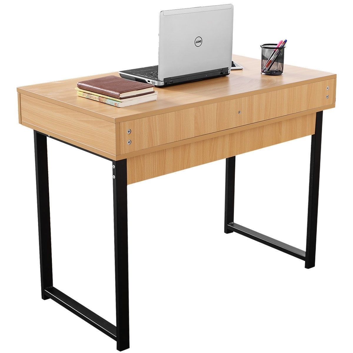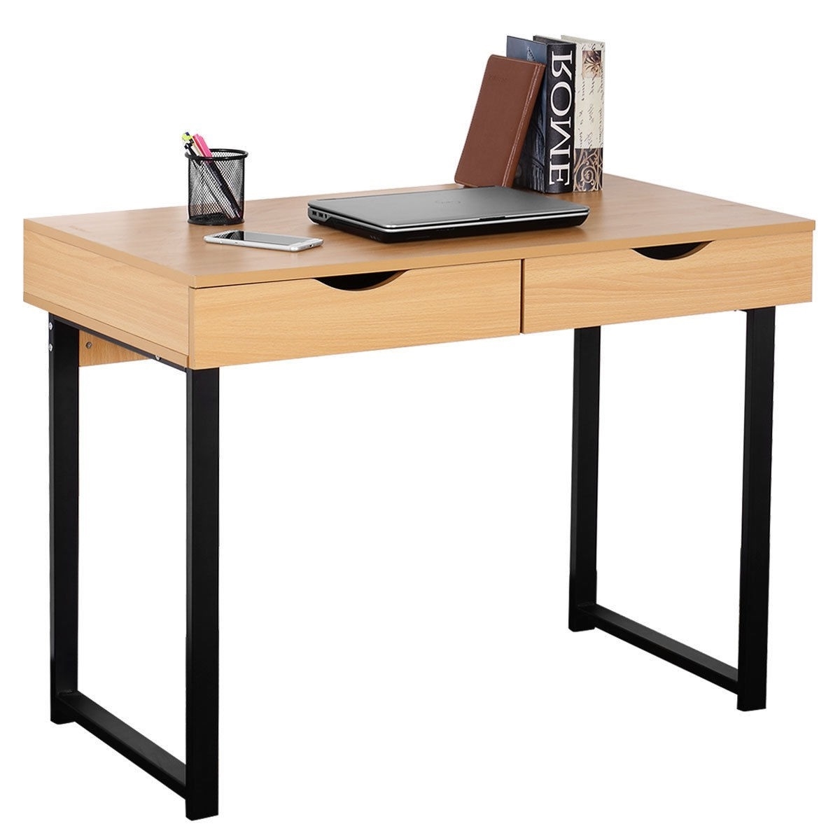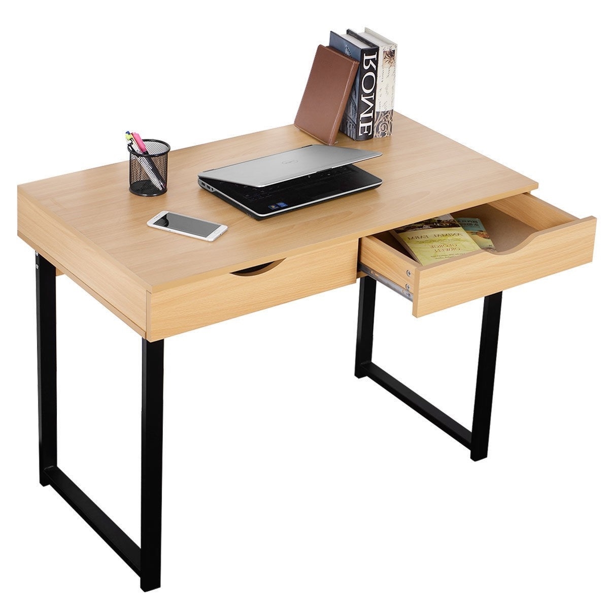 Modern Low Rise Laptop Computer Desk with Two Storage Drawers High quality and brand new Steel frame and high-quality particle board, sturdy and durable Simple and modern design Space saving, perfect for limited space Great for personal or business purposes use Color: Wood color Material: Steel, particle board and ABS Package include: 1 x computer desk