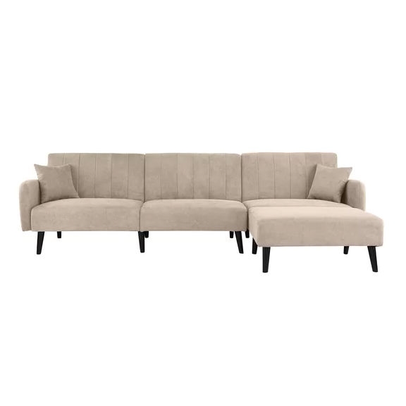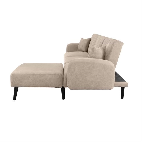 Modern Mid-Century Beige Linen Upholstered Sleeper Sectional Sofa Fully reclining capabilities, all seats recline individually to individual preference with detached reversible chaise Mid-Century style sectional sofa with pleated details Seat and back rests are filled with high-density foam, built to last Upholstered in hand picked linen fabric on wooden frame with pleated details on back rest Includes 2 pillows Sofa Section Width Only: 73″ Product Details Upholstery Material: 100% Linen Frame Material: Solid Wood Detachable Mattress Included: No Assembly Required: Yes Chaise Width: 39″
