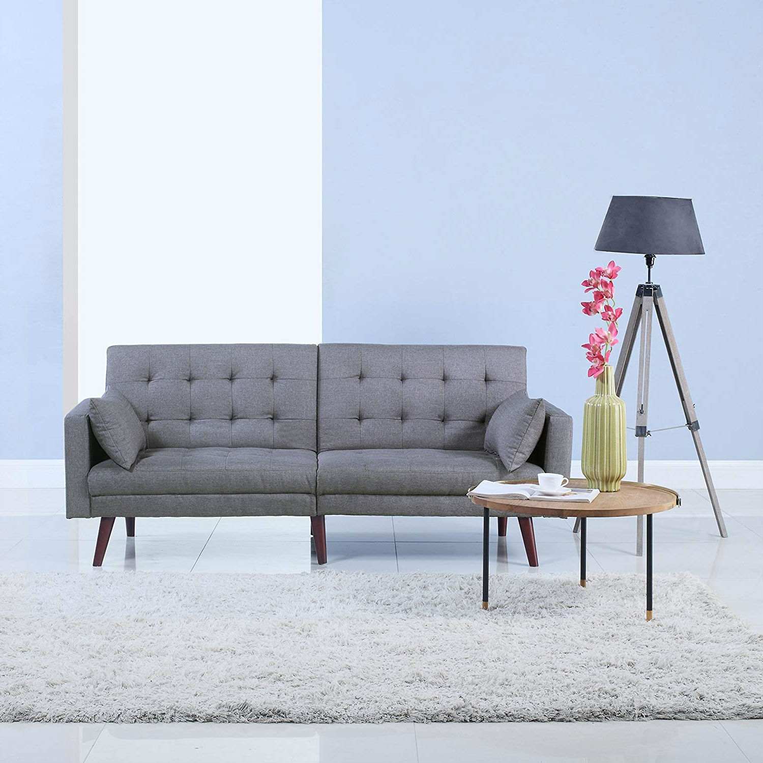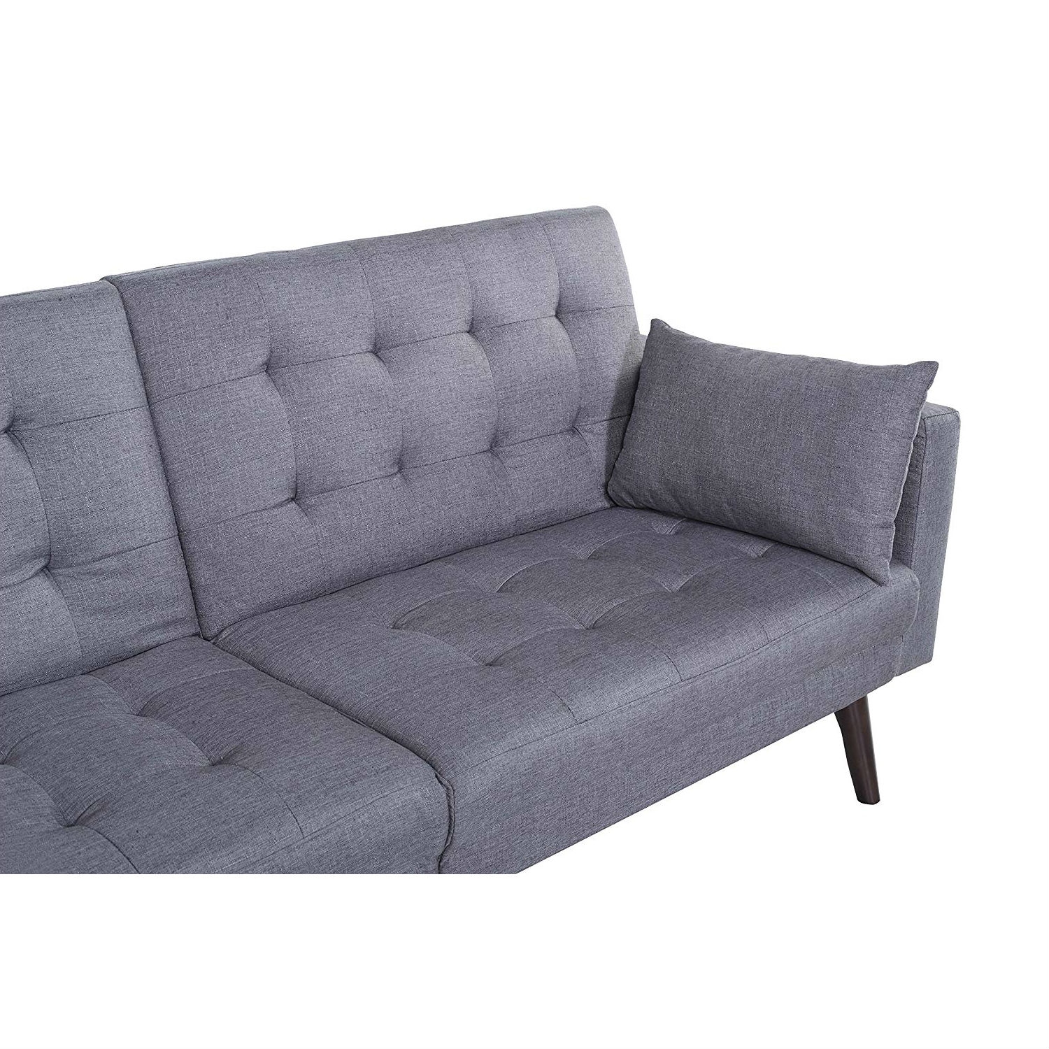Modern Mid-Century Light Grey Linen Split-Back Sofa Bed Modern linen splitback futon in soft linen fabric upholstery Easily converts from sitting to lounging and sleeping Features 6 dark wooden legs for extra support and give a mid-century modern look and feel Easy to recline and arm rests are removable Includes 2 bolster pillows in the same fabric Easy assembly – all hardware is stored in mesh-like fabric in base of the futon