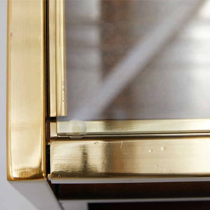 The Modern Steel Brass-Plated Walnut Glass Top Retro Coffee Table can blend with a variety of modern spaces, but really shines when part of a Retro Glam, Old Hollywood-inspired living room. The steel tube frame is pulled straight out of the Art Deco era with its brass-plated finish and simple, squared lines. The sturdy engineered wood construction is covered with warm walnut veneers that really emphasize the mid-century modern appeal of this coffee table.