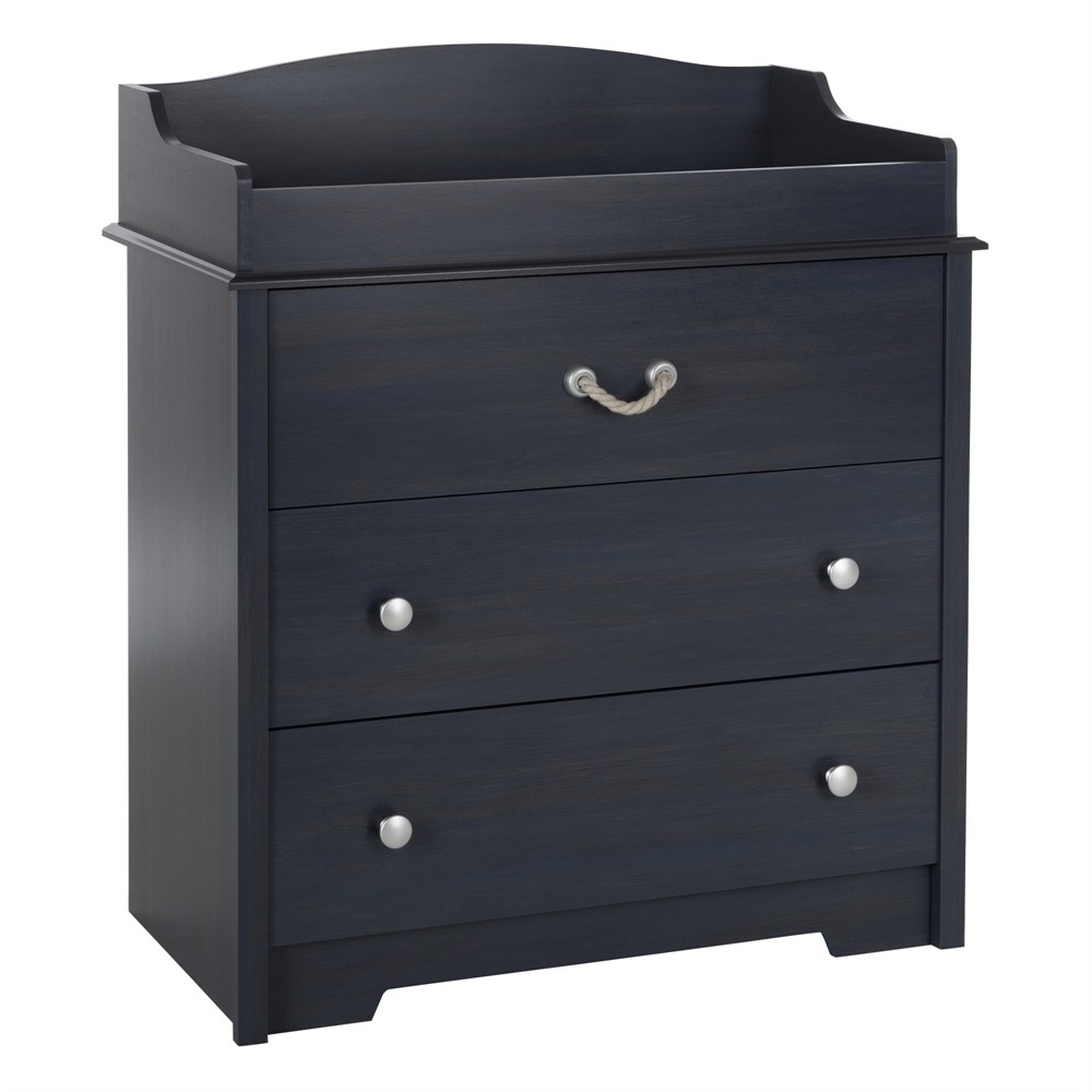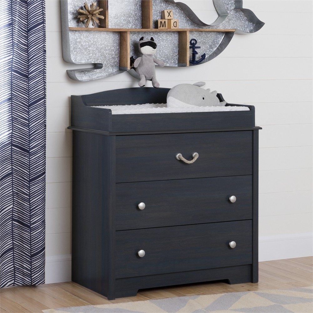 Bring some nautical charm with this stylish changing table turned dresser to add coastal flair to any room. The Nautical Nursery 3 Drawer Rope Handle Baby Changing Table in Dark Blue is sure to be the centerpiece of your nursery, and its handy storage spaces make it really useful. The top drawer features an easy to pull rope-like handle and the bottom two drawers with cute knobs. Versatile Storage This changing table features 3 large drawers with smooth metal slides for quiet and easy access.