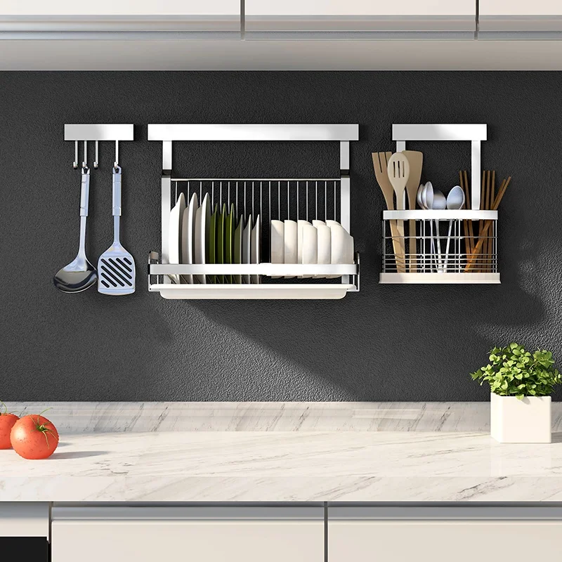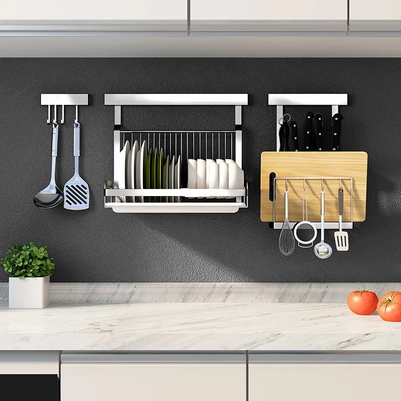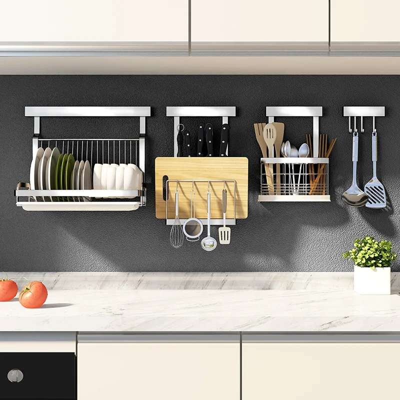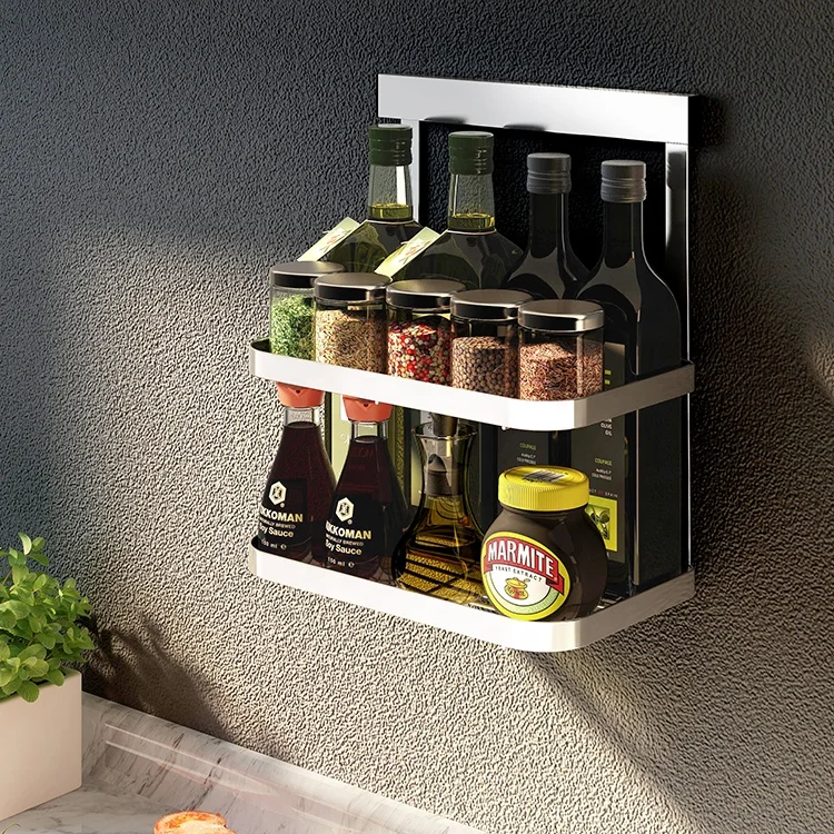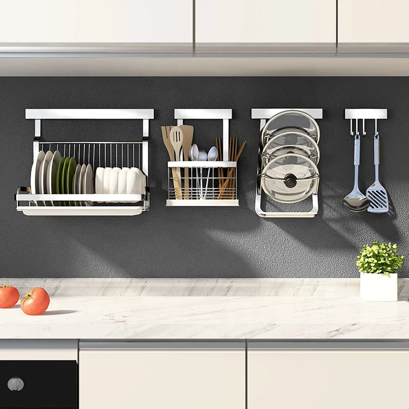 No punching set kitchen organization stainless steel wall mounted shelf Holders spice dish drying rack vegetable storage basket