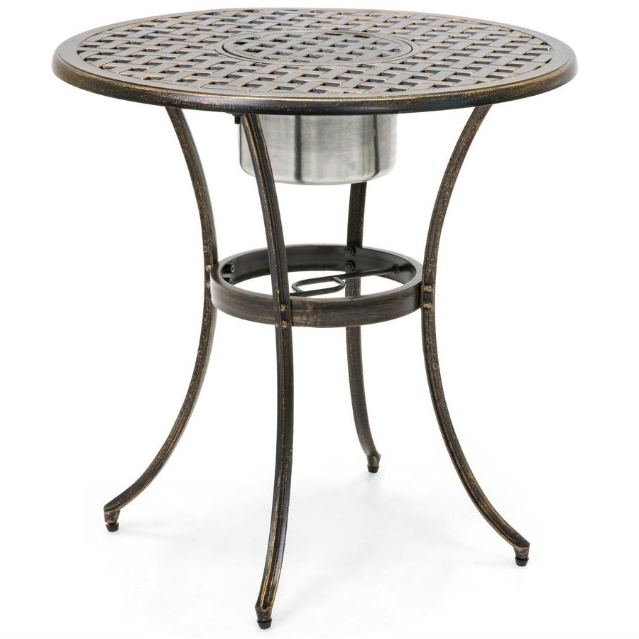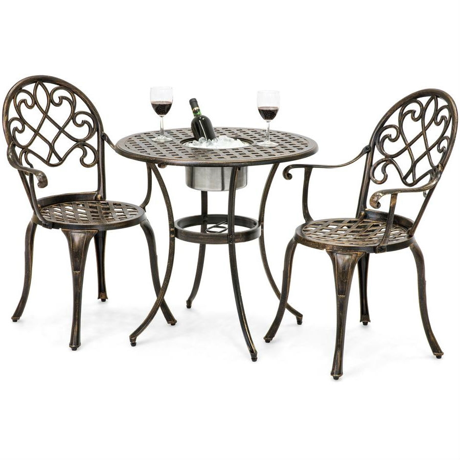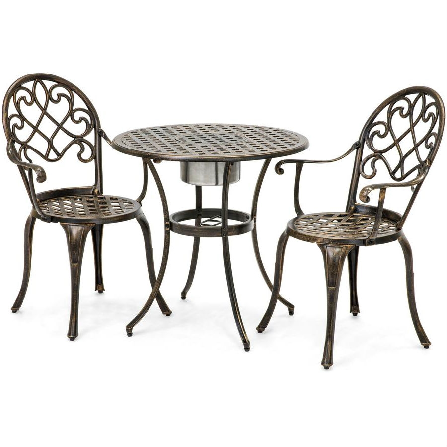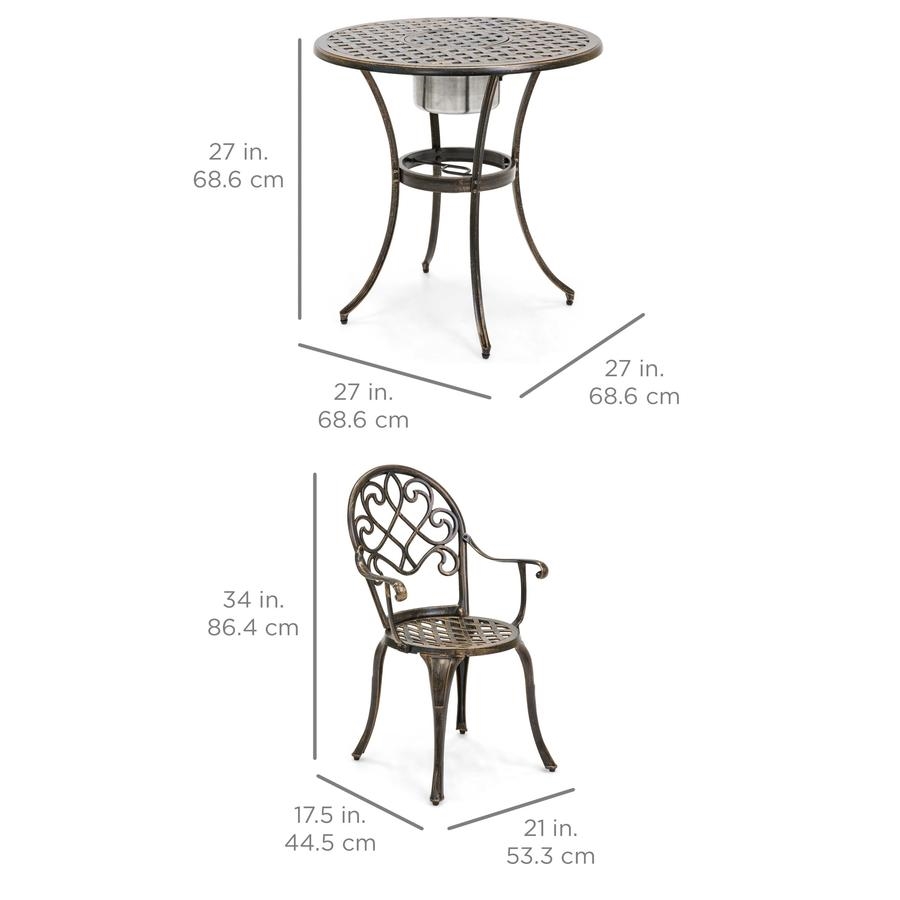 Outdoor 3-Piece Patio Furniture Bistro Set in Antique Copper Finish Includes convenient ice bucket in the center Conveniently keeps your drinks cold Gives intimate bistro feel to any area Antique copper finish Comfortable and lightweight Sturdy, cast aluminum construction Chair Capacity: 220 lbs. Table Capacity: 143 lbs. Color: Copper Material: Aluminum Assembly required (with instructions)
